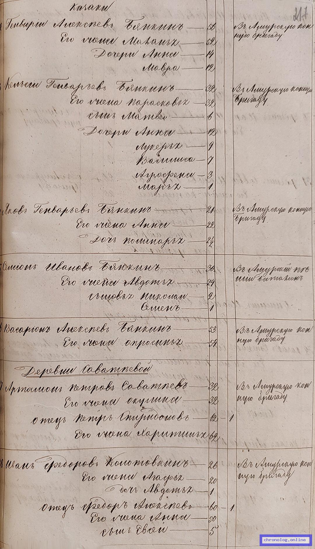 ГАЗК 30-2-270, Л.110, 133, 239 (Посемейные списки переселенцев на р. Амур): Казак 11-го пешего батальона Яков-Второй Лукович Соломатов 32 его жена Елена 29 дочь Агафья 3. Исход: село Куенское Нерчинского уезда. Снимки: 110, 133, 239. | |||