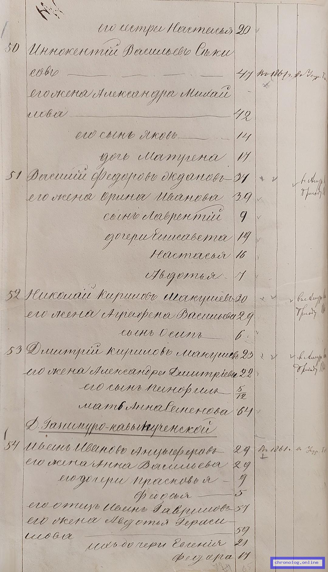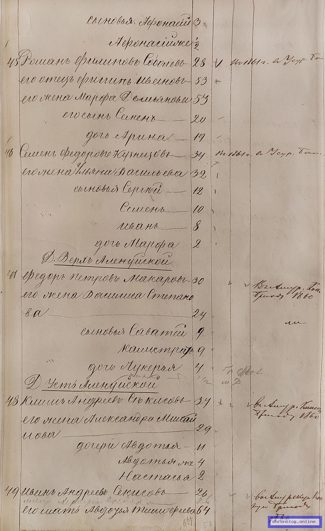 ГАЗК 30-2-270, Л.73об, 74, 139 (Посемейные списки переселенцев на р. Амур): Казак 7-го пешего батальона Афонасий Егорович Ушаков 20 его жена Татьяна 20 мать Настасья 42 её сын Василий 16 дочери Евдокия 15 Анна 10. Исход: деревня Маректинская Нерчинского уезда. Снимки: 73об, 74, 139. | |||