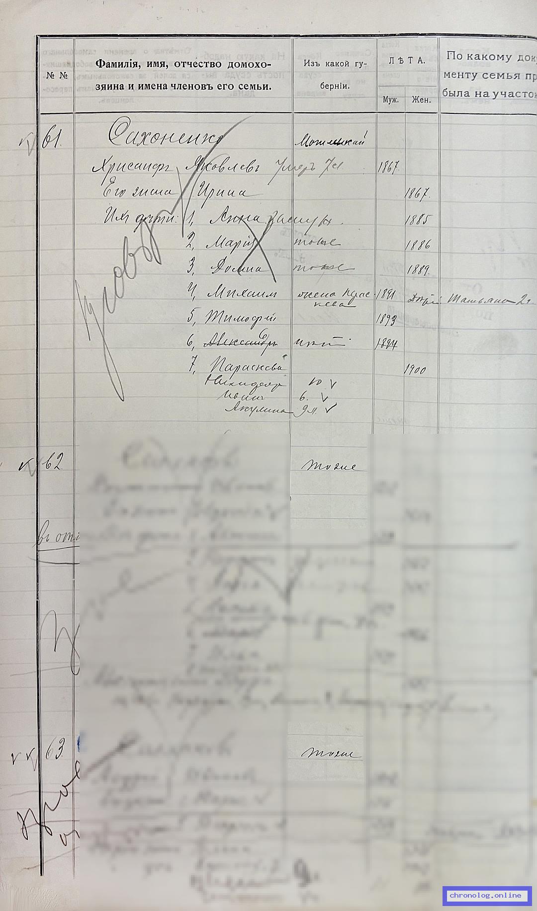РГИАДВ 125-1-5, Л.21об.,22 (Книга регистрации переселенцев, водворённых на участок Георгиевку Киинской волости ): Сахоненко Хрисанф Яковлевич *1867, его жена Ирина *1867. Их дети: Анна *1885, Мария *1886, Домна *1889, Михаил *1891, Тимофей *1893, Александр *1894, Параскева *1900, Никифор 10 лет, Иван 6 лет, Акулина 9 лет. Жена Михаила Параскева, дочь их Татьяна 2 лет. Исход: Могилёвская губерния. Снимки: 21об, 22. | |||