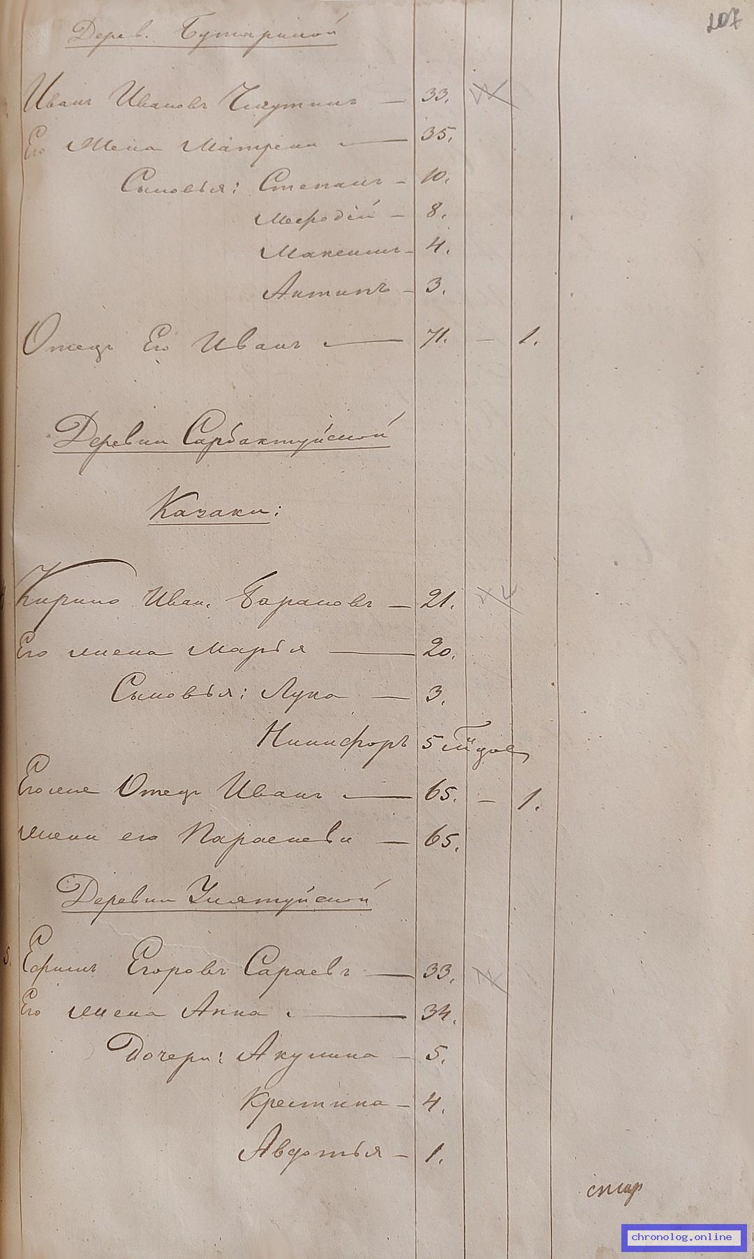 ГАЗК 30-2-270, Л.83, 207, 260об, 275 (Посемейные списки переселенцев на р. Амур): Казак 8-го пешего батальона Кирило Иванович Баранов 22 жена его Марья 21 сыновья Лука 4 Никифор 10 месяцев отец его Иван 66 мать Парасковья 66. Исход: деревня Сарбактуйская Нерчинского уезда. Снимки: 83, 207, 260об, 275. | |||