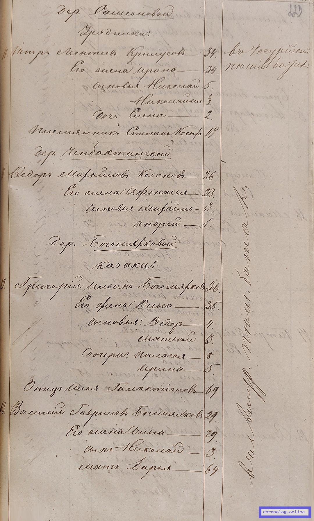 ГАЗК 30-2-270, Л.95, 95об, 214, 223 (Посемейные списки переселенцев на р. Амур): Урядник 9-го пешего батальона Пётр Леонтьевич Крылусов 34 его жена Ирина 34 сыновья Николай-Первый 5 Николай-Второй полгода дочь Елена 2 племянник Степан Косых 17. Исход: деревня Самсонова Нерчинского уезда. Снимки: 95, 95об, 214, 223. | |||
