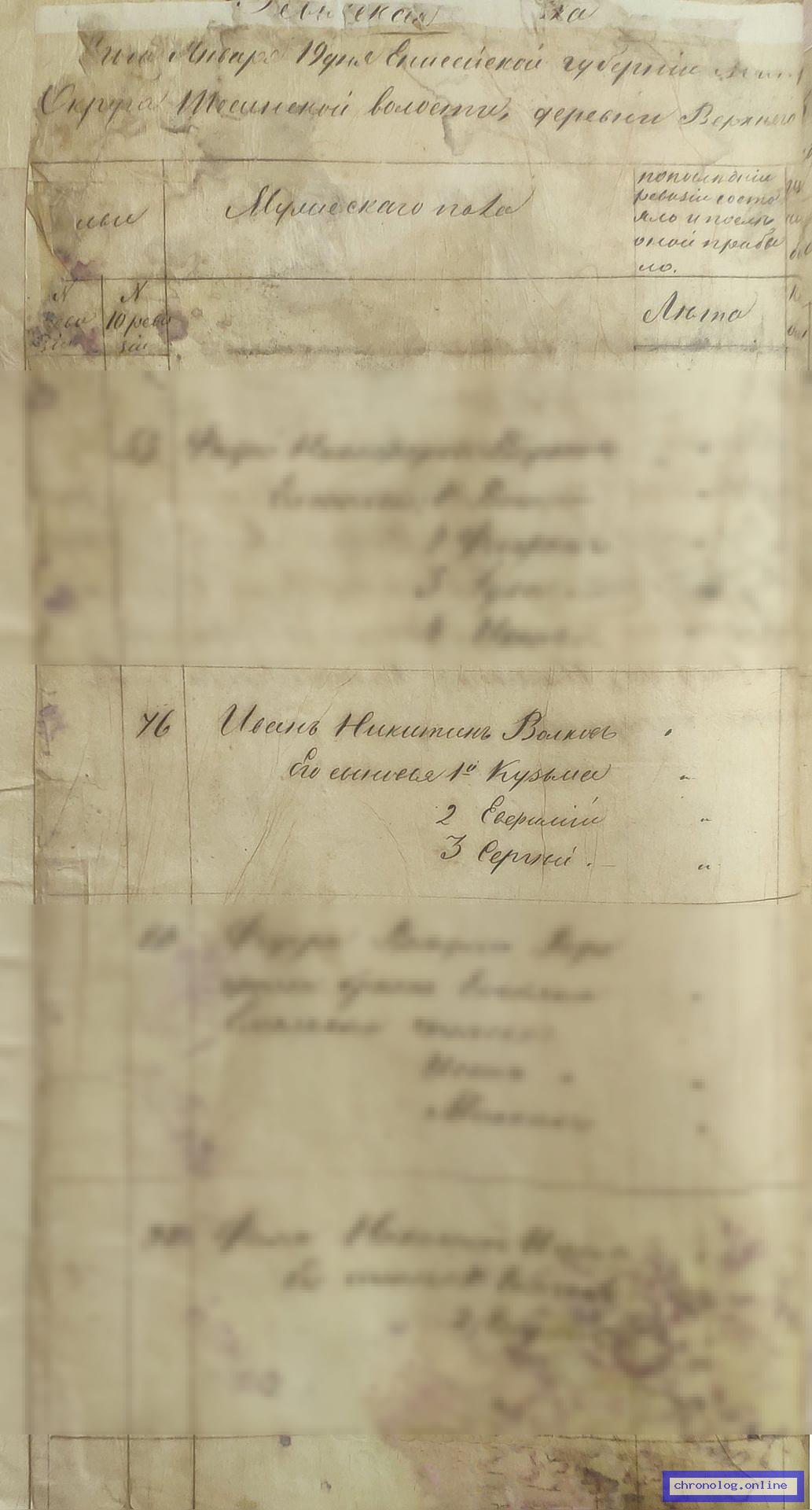 РГИАДВ 704-4-90, Л.17об., 18 (О причислении к сельским обществам Амурской области переселенцев Воронова Ф.Н., Волкова И.Н. и др. в 1865 году): Крестьянин Иван Никитович Волков 37 лет, у него жена Анастасия Леонтьевна 35 лет. У них дети: Кузьма 13 лет, Евфим 7 с половиной лет, Сергей 1 год, Елизавета 11 лет, Евдокия 4 лет - по данным ревизской сказки 1858 года. Исход: деревня Верхняя Кулибара Тесинской волости Минусинского округа Енисейской губернии. Снимки: 17об, 18. | |||