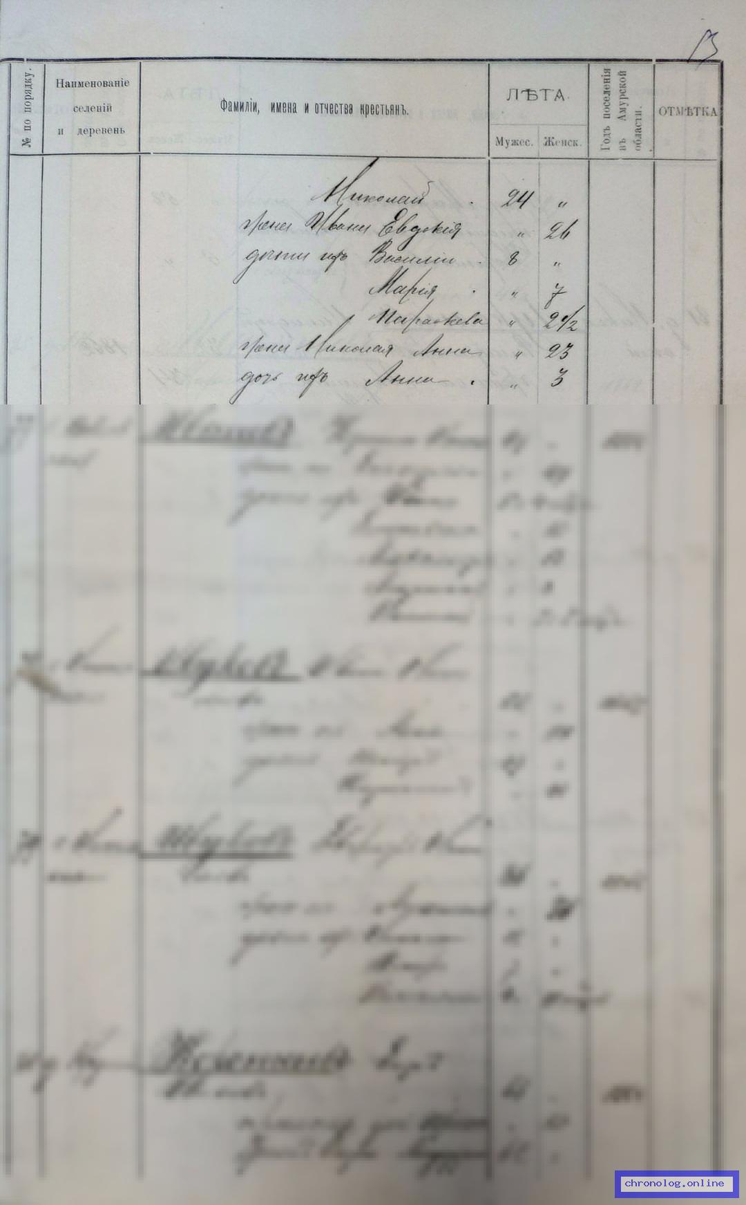 РГИАДВ 704-4-706, Л.49об (Списки переселенцев и сельских обществ Амурской области на 1897 год): Никитин Алексей Иванович 43 лет. Жена Аграфена Михайловна 43 лет, дети их: Яков 6 лет, Наталья 10 лет, Анна 8 лет. Время и место исхода не показано. Снимки: 49об. | |||
