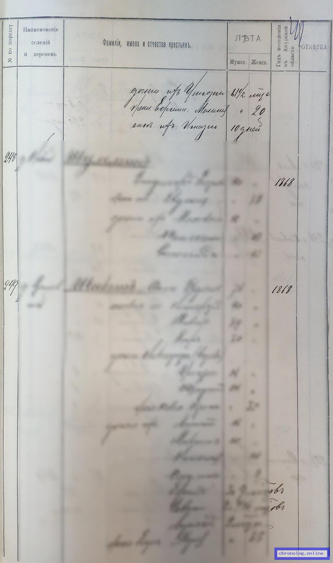 Поскольку Дальний Восток с середины XIX века испытывал серьёзный приток переселенцев как с территорий многих российских губерний, так и из ближайшего зарубежья, в проходных свидетельствах и иных документах были записаны наименование родного села или деревни, волости, уезда или страны откуда прибывал человек. Наличие или отсутствие данных о месте исхода показано в колонке "Документ".