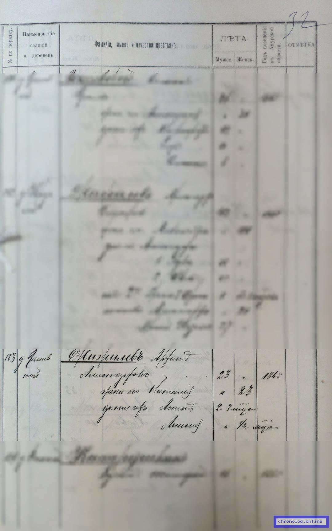 РГИАДВ 704-4-6107, Л.32 (Список крестьян Томской волости на 1900 год): Жижимов Архип Алистерхович 23 лет, жена Наталия 23 лет. Дети: Логин 2 лет 3 месяцев, Анисия 15 дней. Жительство имеют в деревне Заливной с 1865 года. Время и место исхода не показано. Снимки: 32. | |||