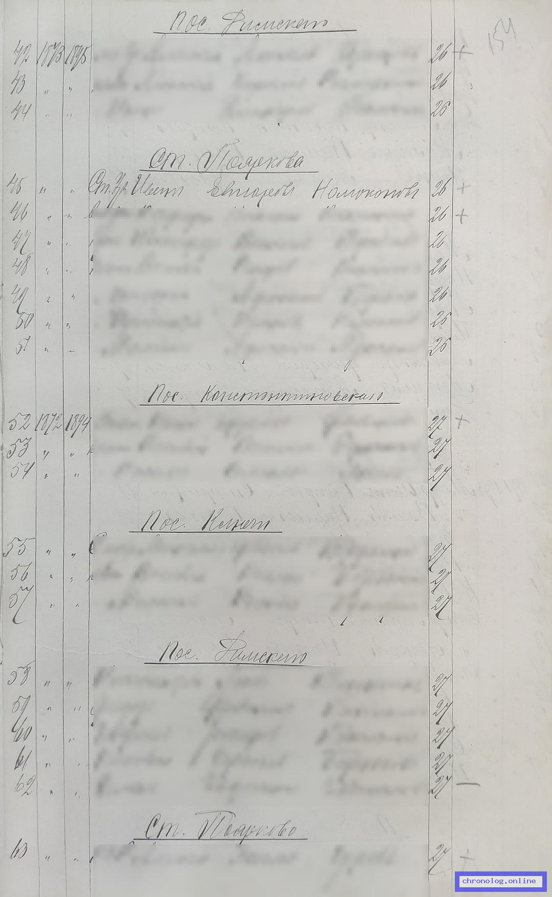 РГИАДВ 793-1-419, Л.154 (Списки казакам, вахмистрам, урядникам Амурского казачьего войска по возрастам, разрядам и округам на 1900 год): Старший урядник Иван Елизарович Номоконов 26 лет из станицы Поярково показан в списке второй очереди по Поярковскому станичному округу. Время и место исхода не показано. Снимки: 154. | |||