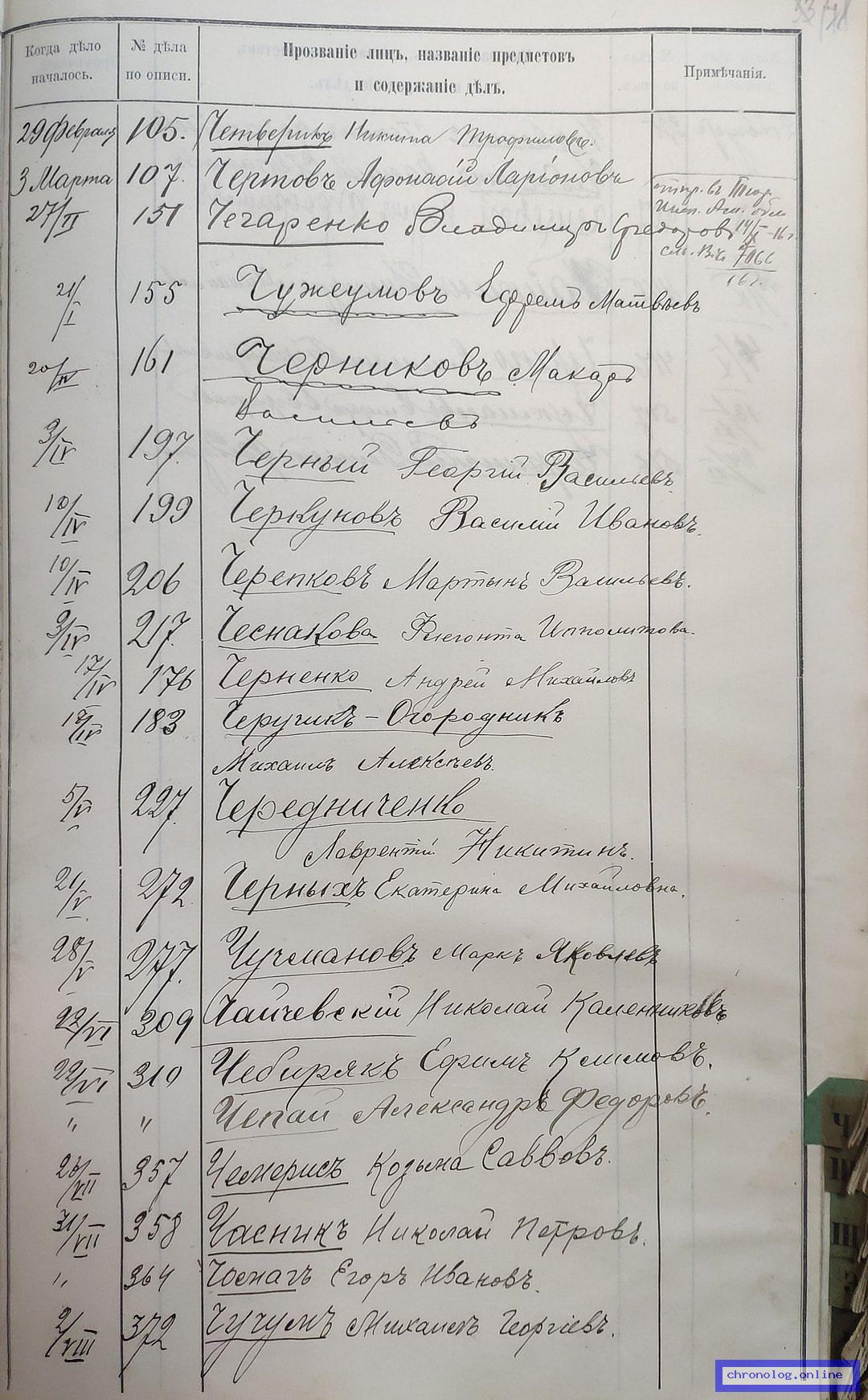 РГИАДВ 704-4-3230, Л.178 (Указатель дел переселенческой части за 1912 год): Чучум Михаил Георгиевич показан со ссылкой на дело (старая опись, нумерация не действительная) №372 от 2.8.1912. Время и место исхода не показано. Снимки: 178. | |||