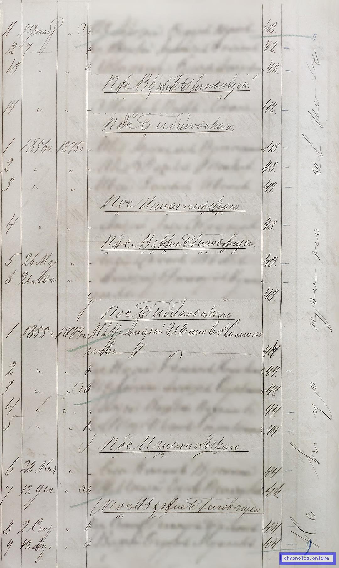 РГИАДВ 746-1-36, Л.48 (Именные списки крестьян и сведения о имеющейся земле за 1896 год): В сводной таблице о посевах пшеницы, ярицы, ячменя, овса, гречи и просо показан Толмачев Данила из деревни Васильевки. Время и место исхода не показано. Снимки: 48. | |||