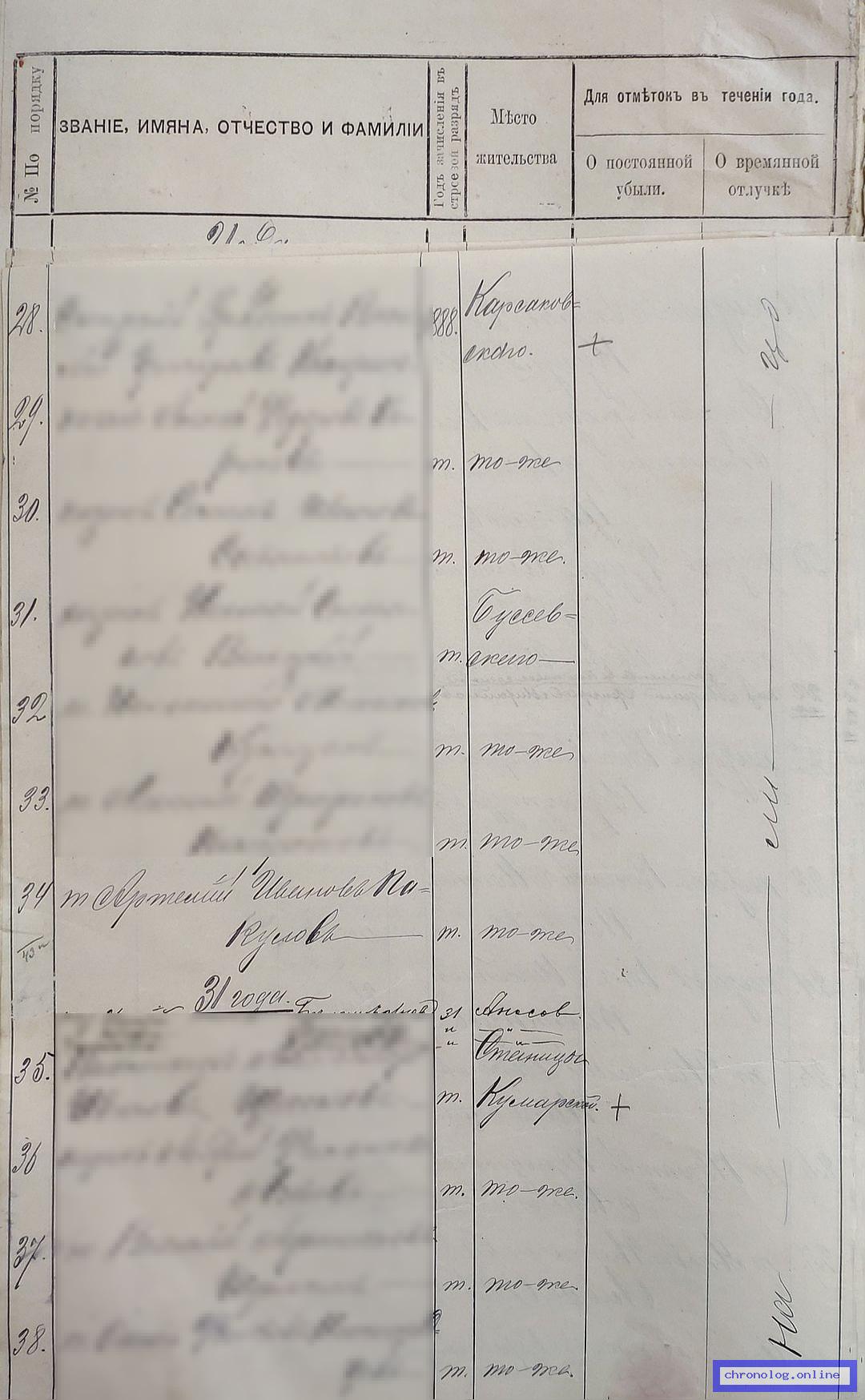 РГИАДВ 793-1-419, Л.85об (Списки казакам, вахмистрам, урядникам Амурского казачьего войска по возрастам, разрядам и округам на 1900 год): Трубач Артемий Иванович Пакулов 30 лет из посёлка Буссевского показан в списке третьей очереди по Кумарскому станичному округу. Время и место исхода не показано. Снимки: 85об. | |||