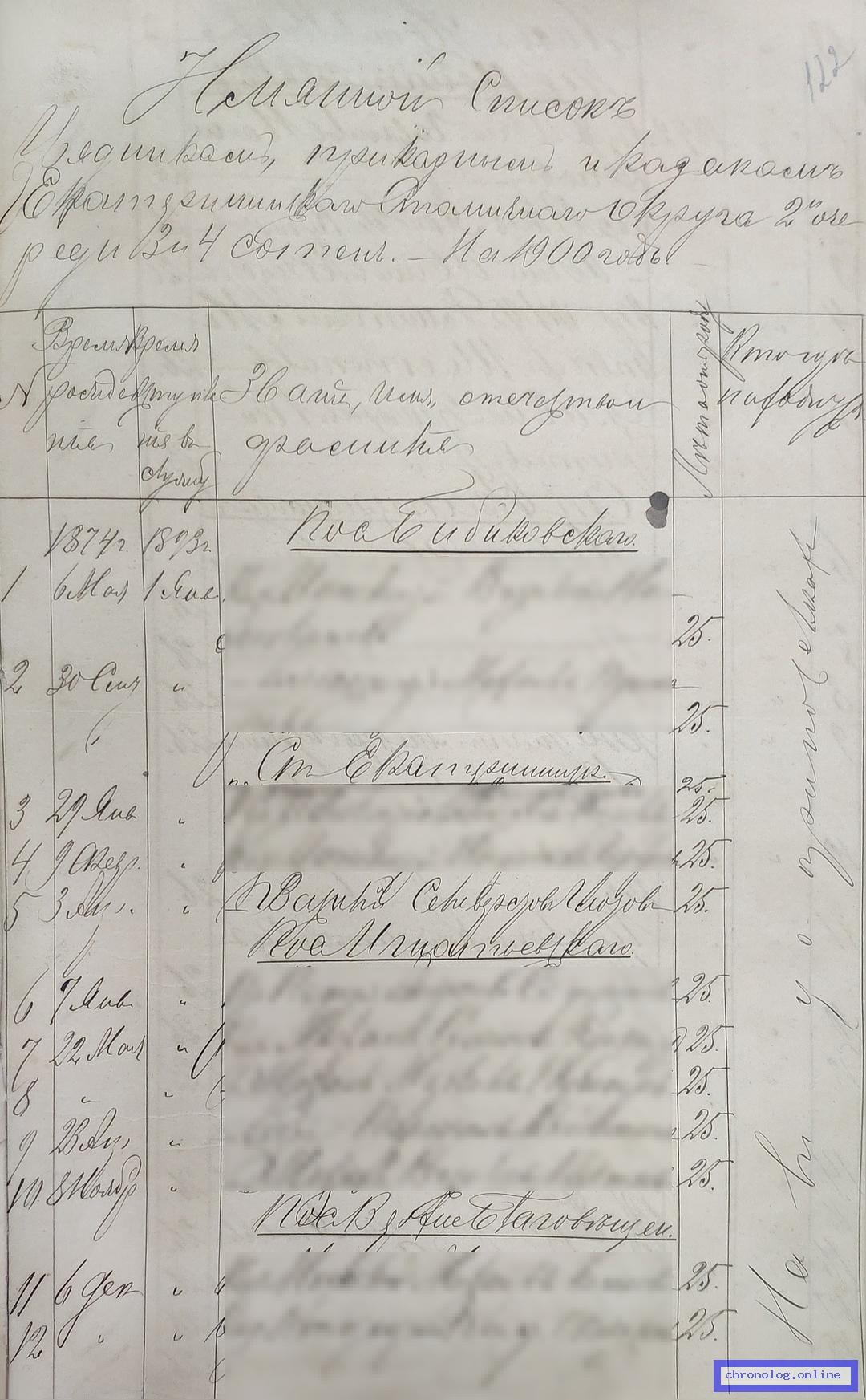 РГИАДВ 793-1-419, Л.122 (Списки казакам, вахмистрам, урядникам Амурского казачьего войска по возрастам, разрядам и округам на 1900 год): Казак Василий Селиверстович Глотов 25 лет из станицы Екатерининской показан в списке второй очереди по Екатерининскому станичному округу. Время и место исхода не показано. Снимки: 122. | |||