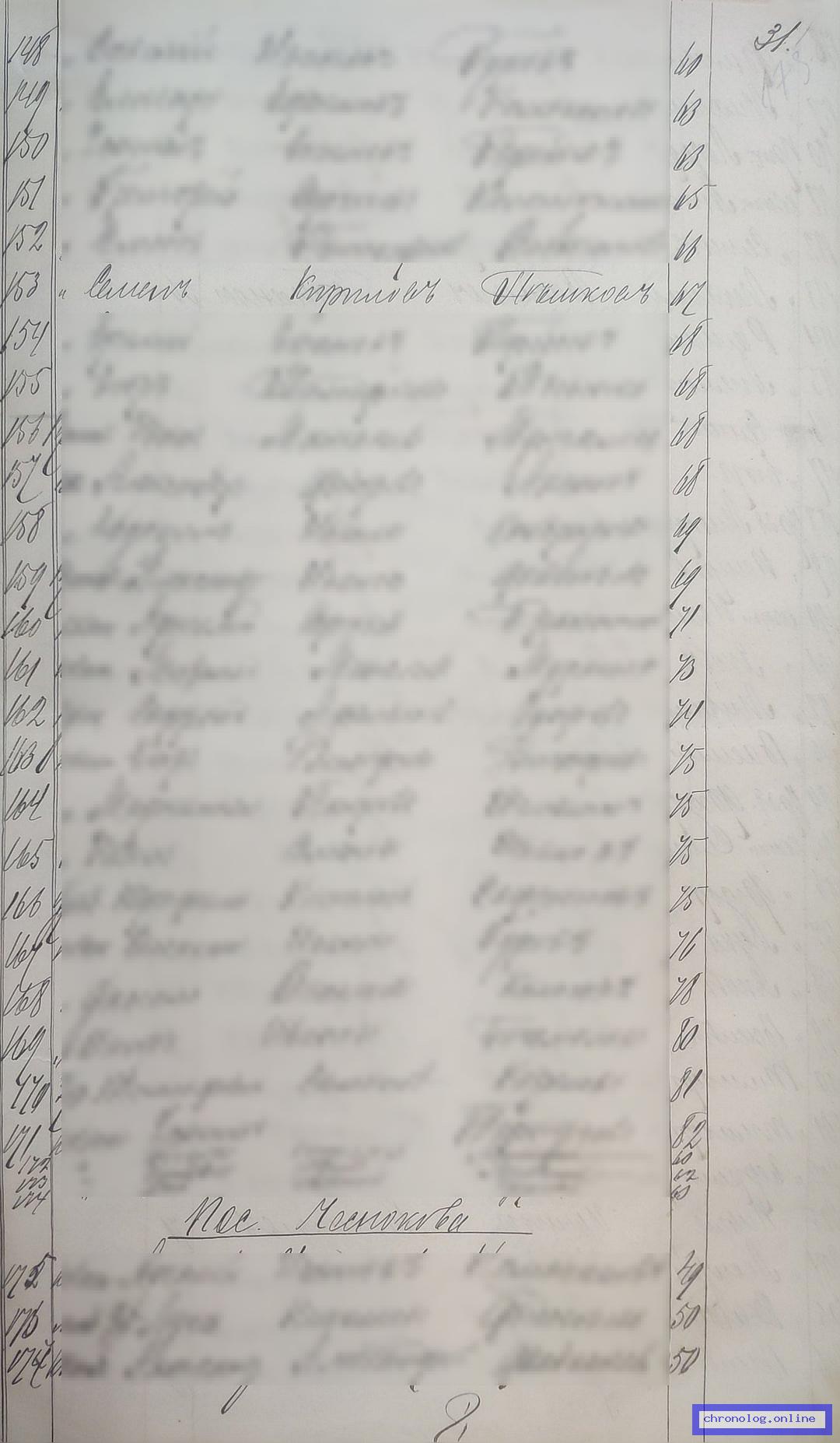 РГИАДВ 793-1-419, Л.175 (Списки казакам, вахмистрам, урядникам Амурского казачьего войска по возрастам, разрядам и округам на 1900 год): Казак Семён Кириллович Пешков 67 лет показан в списке по станице Поярково Поярковского станичного округа. Время и место исхода не показано. Снимки: 175. | |||