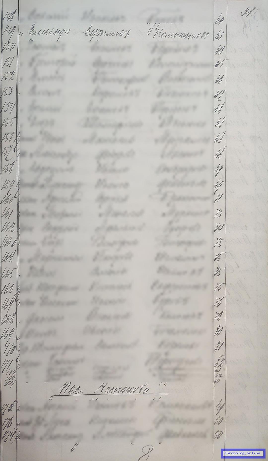 РГИАДВ 793-1-419, Л.33об (Списки казакам, вахмистрам, урядникам Амурского казачьего войска по возрастам, разрядам и округам на 1900 год): Казак запасного разряда Егор Васильевич Сенотрусов из выселка Бекетовского показан в списке по Албазинскому станичному округу. Время и место исхода не показано. Снимки: 33об. | |||
