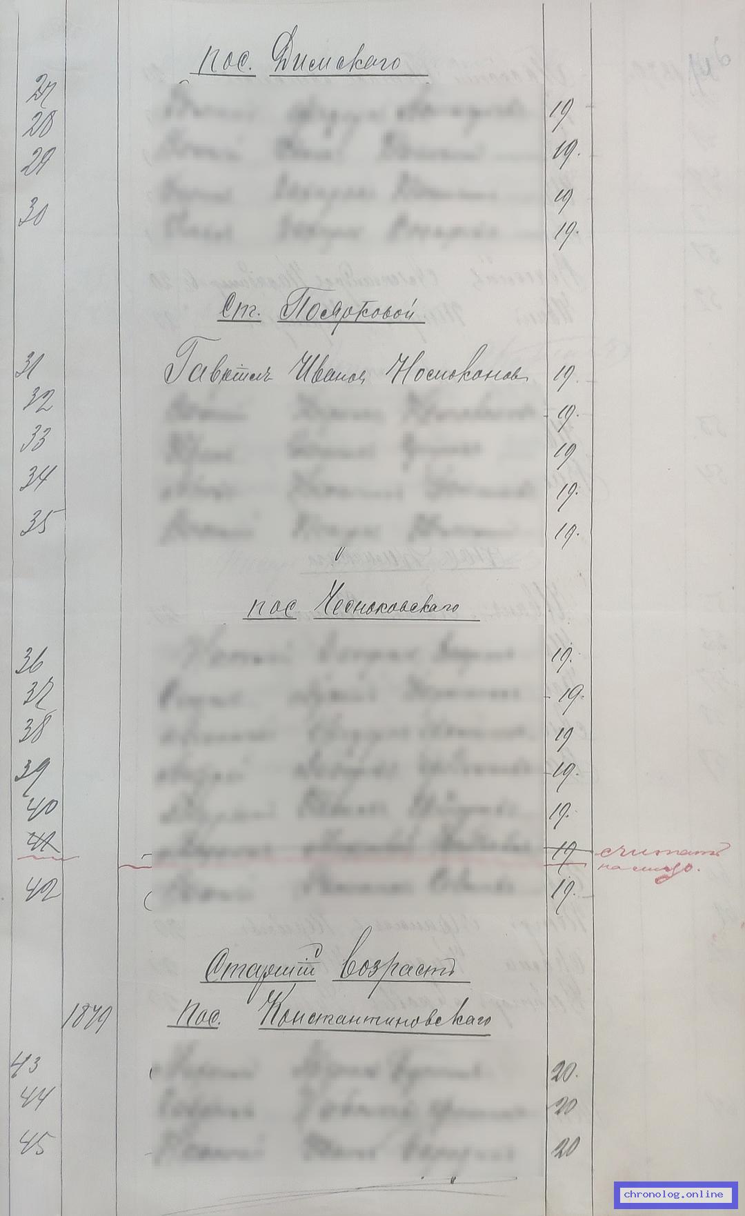 РГИАДВ 793-1-419, Л.174об (Списки казакам, вахмистрам, урядникам Амурского казачьего войска по возрастам, разрядам и округам на 1900 год): Казак Иван Петрович Номоконов 49 лет из станицы Поярково показан в списке по Поярковскому станичному округу. Время и место исхода не показано. Снимки: 174об. | |||