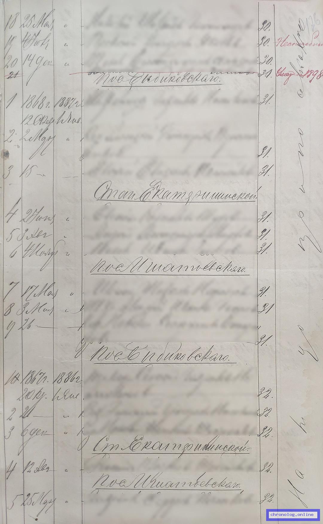 РГИАДВ 793-1-419, Л.133об (Списки казакам, вахмистрам, урядникам Амурского казачьего войска по возрастам, разрядам и округам на 1900 год): Казак Егор Михайлович Пушкарёв 39 лет из посёлка Бибиковского показан в списке ополчения по Екатерининскому станичному округу. Время и место исхода не показано. Снимки: 133об. | |||