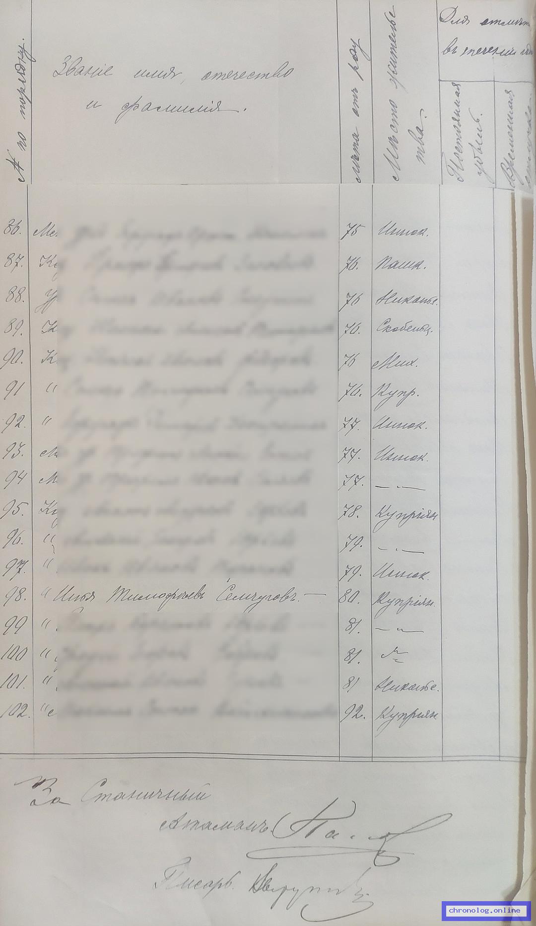 РГИАДВ 793-1-419, Л.216об (Списки казакам, вахмистрам, урядникам Амурского казачьего войска по возрастам, разрядам и округам на 1900 год): Отставной казак Илья Тимофеевич Семчугов 80 лет из посёлка Куприяновского показан в списке по Иннокентьевскому станичному округу. Время и место исхода не показано. Снимки: 216об. | |||
