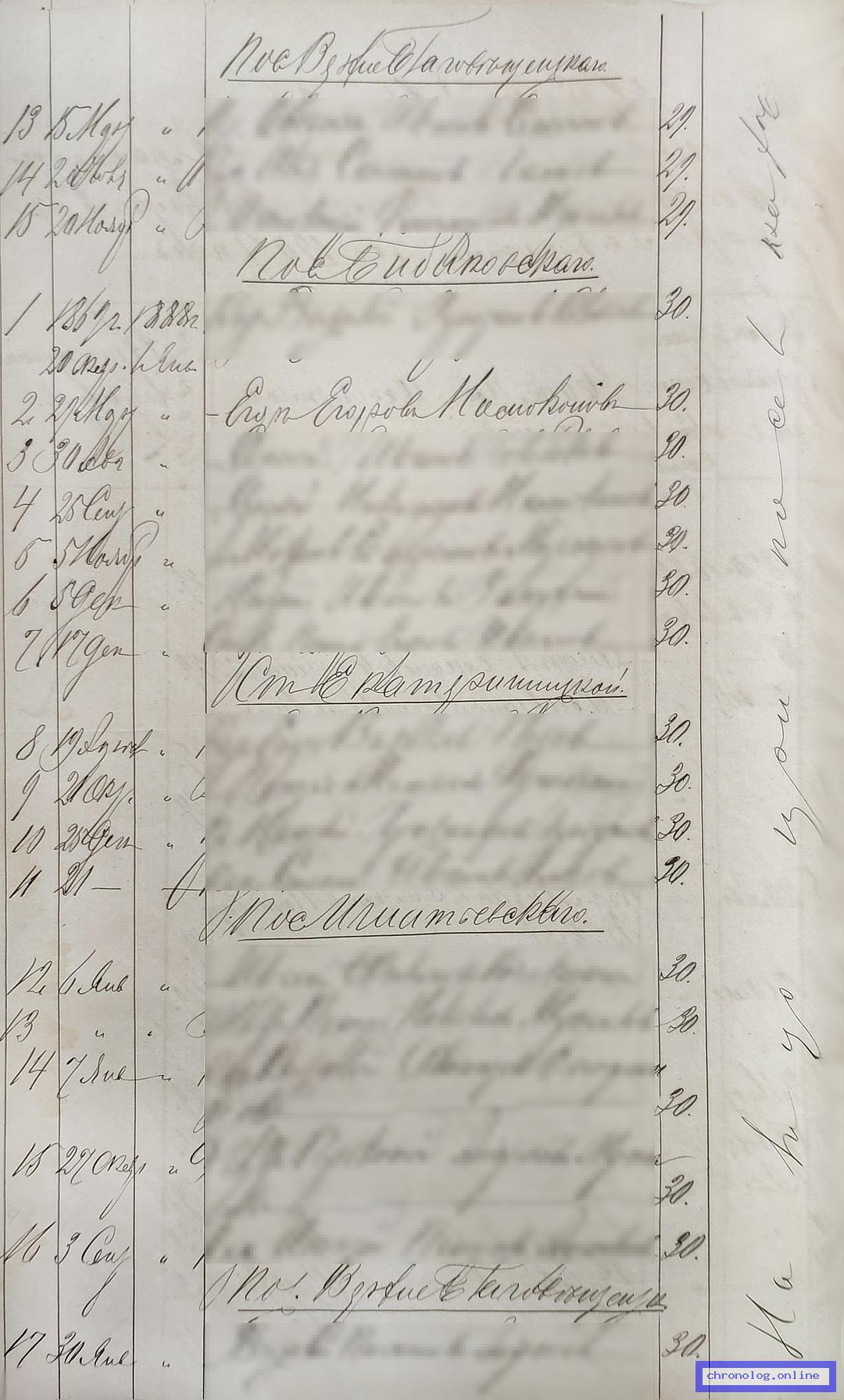 РГИАДВ 793-1-419, Л.215об (Списки казакам, вахмистрам, урядникам Амурского казачьего войска по возрастам, разрядам и округам на 1900 год): Старший урядник Афанасий Михайлович Номоконов 54 лет из посёлка Скобельницкого показан в списке отставных нижних чинов по Иннокентьевскому станичному округу. Время и место исхода не показано. Снимки: 215об. | |||
