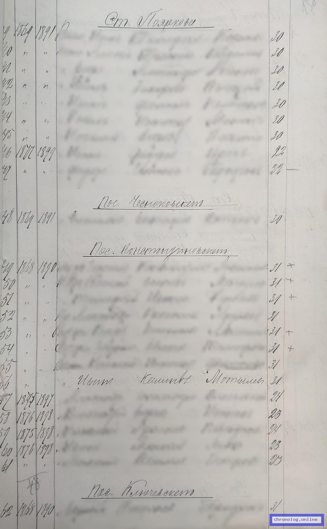 РГИАДВ 793-1-419, Л.158 (Списки казакам, вахмистрам, урядникам Амурского казачьего войска по возрастам, разрядам и округам на 1900 год): Казак Иван Калинович Мотылев 31 лет показан в списке по посёлку Константиновскому Поярковского станичного округа. Время и место исхода не показано. Снимки: 158. | |||