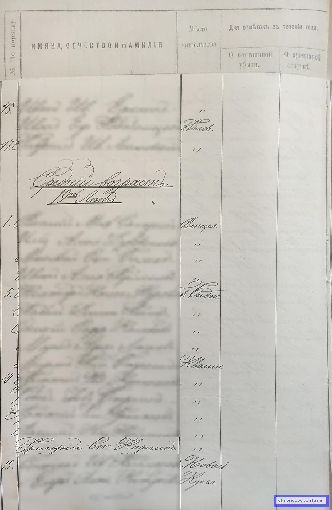 РГИАДВ 793-1-419, Л.265об (Списки казакам, вахмистрам, урядникам Амурского казачьего войска по возрастам, разрядам и округам на 1900 год): Казак приготовительного разряда Григорий Степанович Каргин 19 лет из посёлка Квашнинского показан в списке по Михайлосемёновскому станичному округу. Время и место исхода не показано. Снимки: 265об. | |||