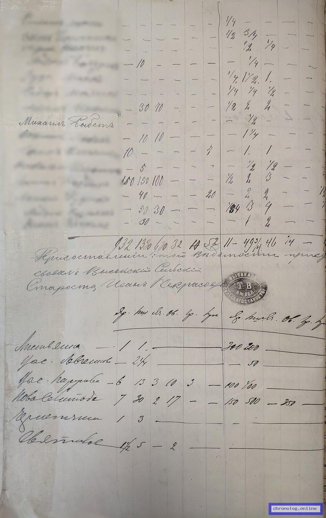 РГИАДВ 746-1-36, Л.38об (Именные списки крестьян и сведения о имеющейся земле за 1896 год): В сводной таблице о посевах пшеницы, ярицы, ячменя, овса, гречи и просо показан Вавилов Аверьян из деревни Круглой. Время и место исхода не показано. Снимки: 38об. | |||