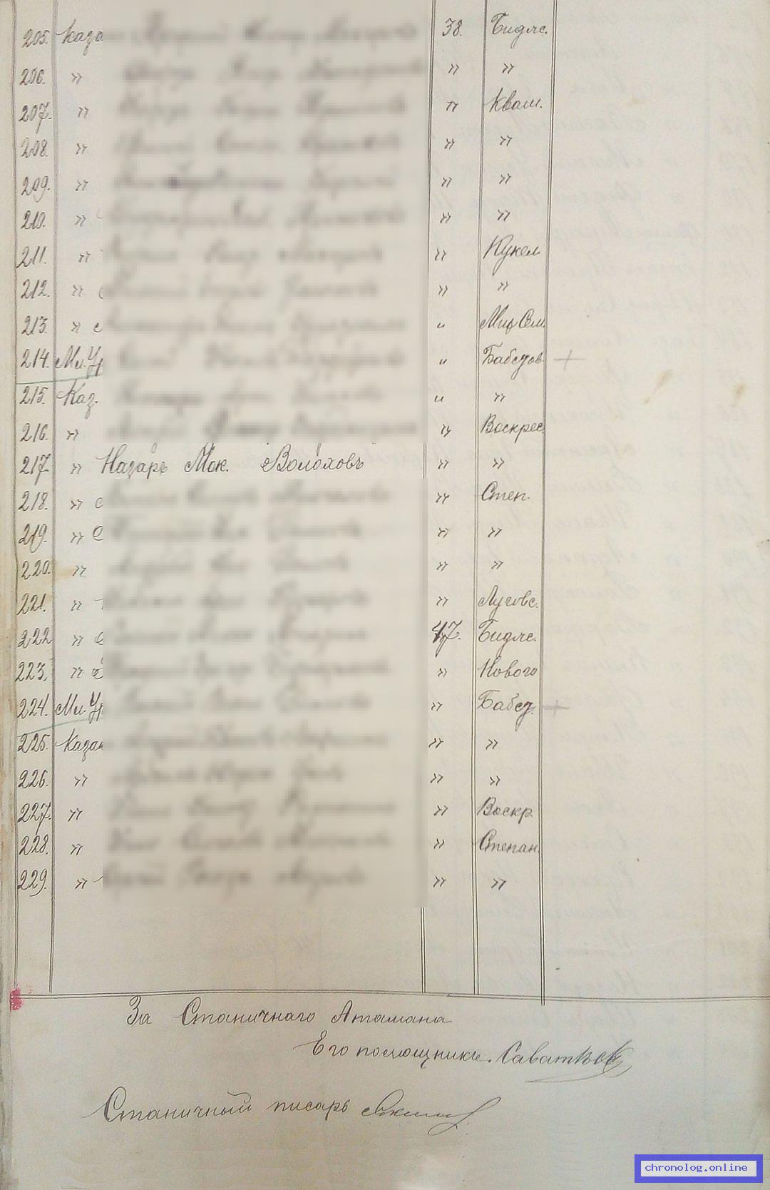 РГИАДВ 793-1-419, Л.134об (Списки казакам, вахмистрам, урядникам Амурского казачьего войска по возрастам, разрядам и округам на 1900 год): Казак Кирилл Романович Номоконов 44 лет из посёлка Бибиковского показан в списке ополчения по Екатерининскому станичному округу. Время и место исхода не показано. Снимки: 134об. | |||