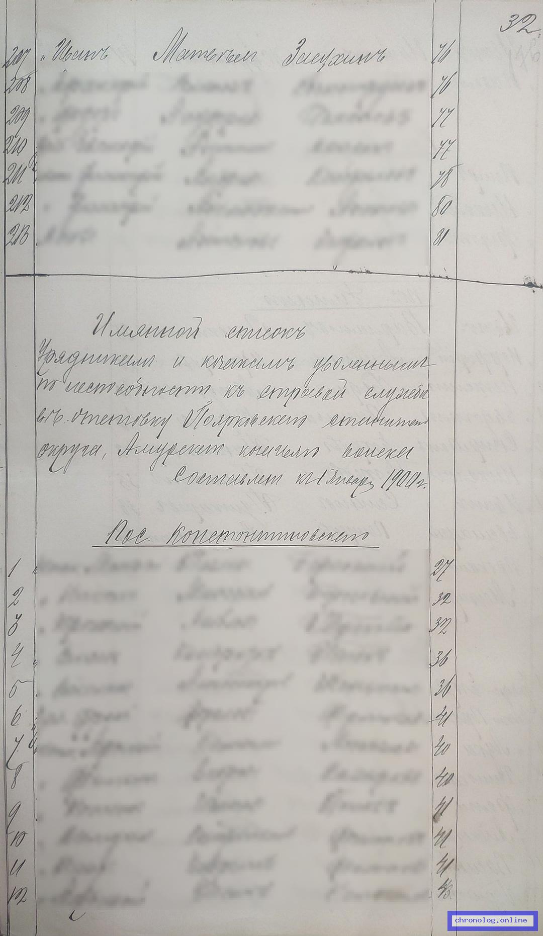 РГИАДВ 793-1-419, Л.176 (Списки казакам, вахмистрам, урядникам Амурского казачьего войска по возрастам, разрядам и округам на 1900 год): Казак Иван Матвеевич Засухин 76 лет из посёлка Чесноковского показан в списке ополчения по Поярковскому станичному округу. Время и место исхода не показано. Снимки: 176. | |||
