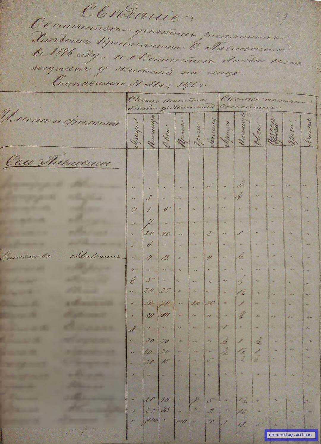 РГИАДВ 746-1-36, Л.39 (Именные списки крестьян и сведения о имеющейся земле за 1896 год): В сводной таблице о посевах пшеницы, ярицы, ячменя, овса, гречи и проса показан Вшивков Максим из села Павловского. Время и место исхода не показано. Снимки: 39. | |||