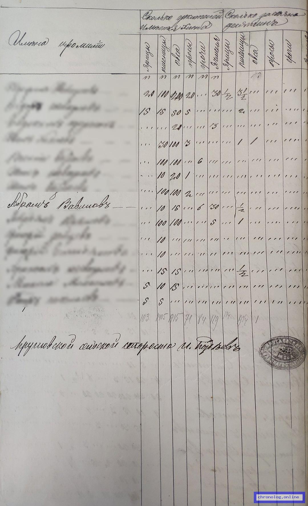РГИАДВ 746-1-36, Л.38об (Именные списки крестьян и сведения о имеющейся земле за 1896 год): В сводной таблице о посевах пшеницы, ярицы, ячменя, овса, гречи и просо показан Вавилов Абрам из деревни Круглой. Время и место исхода не показано. Снимки: 38об. | |||