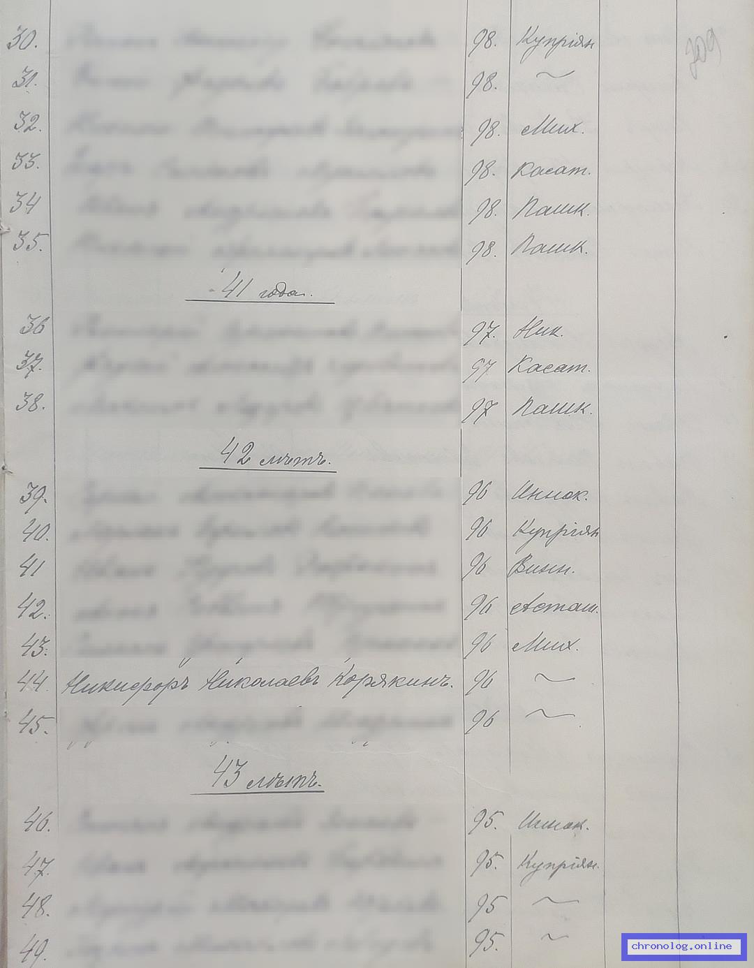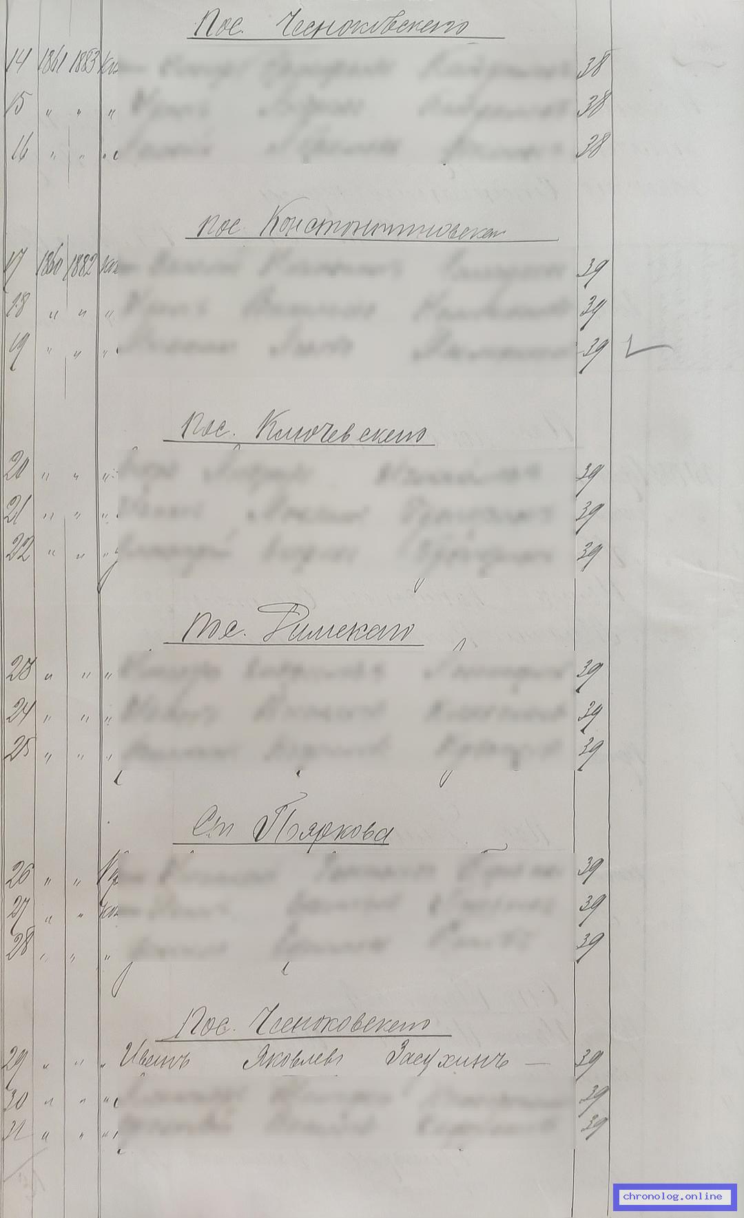 РГИАДВ 793-1-419, Л.166об (Списки казакам, вахмистрам, урядникам Амурского казачьего войска по возрастам, разрядам и округам на 1900 год): Казак Иван Яковлевич Засухин 39 лет из посёлка Чесноковского показан в списке ополчения по Поярковскому станичному округу. Время и место исхода не показано. Снимки: 166об. | |||