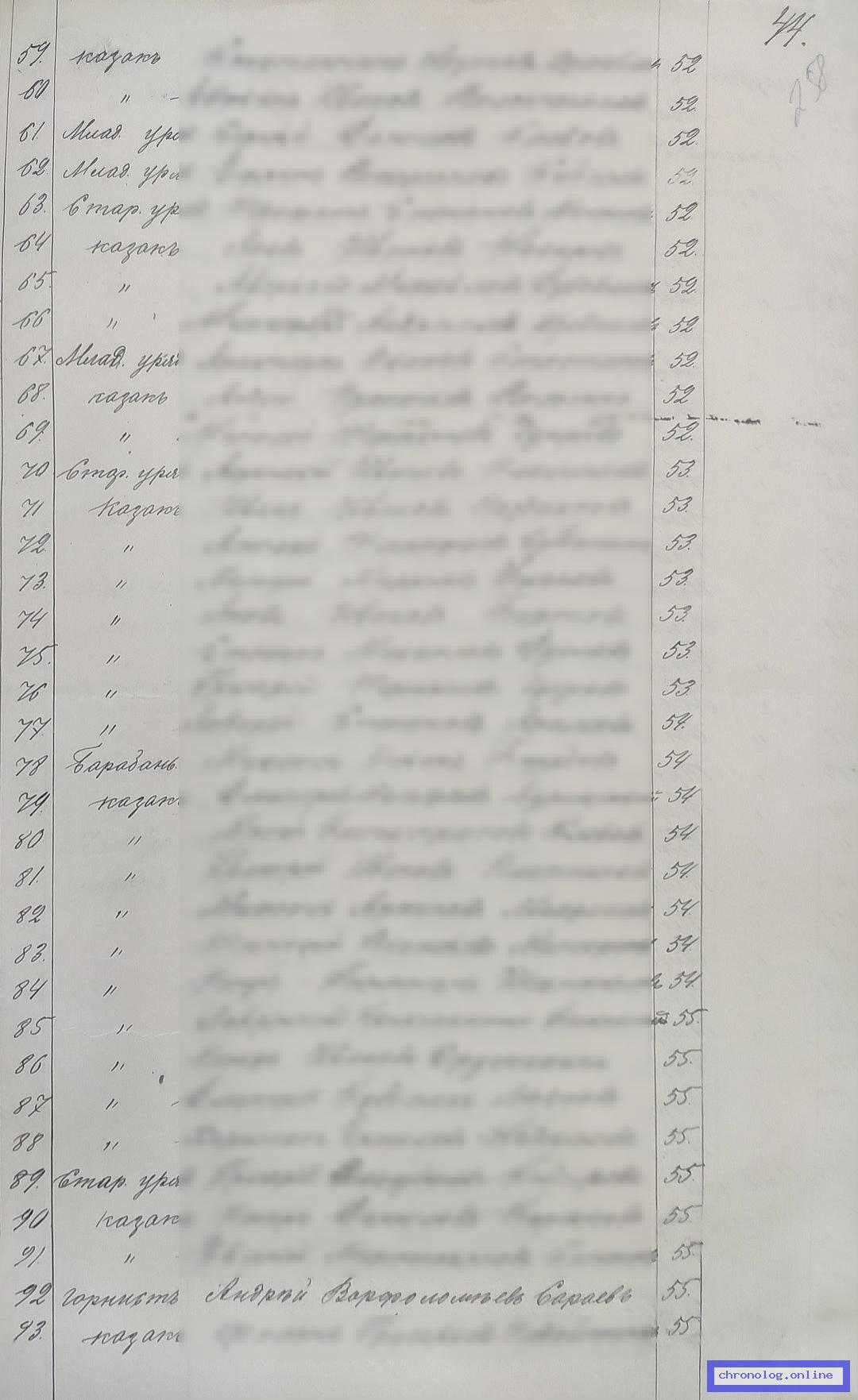 РГИАДВ 793-1-419, Л.258 (Списки казакам, вахмистрам, урядникам Амурского казачьего войска по возрастам, разрядам и округам на 1900 год): Отставной горнист Андрей Варфоломеевич Сараев 55 лет из посёлка Пузиновского показан в списке по Екатерининскому станичному округу. Время и место исхода не показано. Снимки: 258. | |||