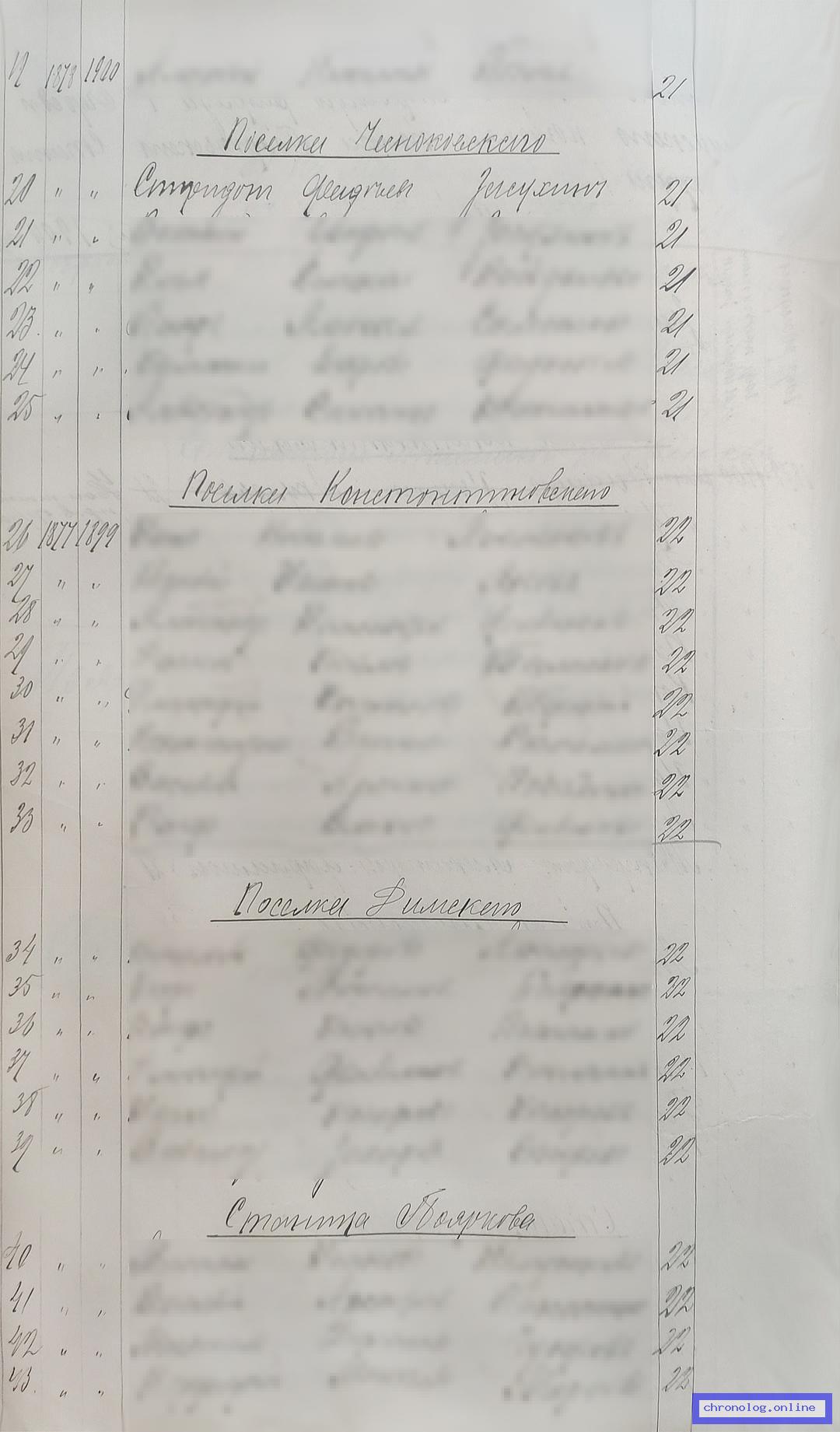 РГИАДВ 793-1-419, Л.149об (Списки казакам, вахмистрам, урядникам Амурского казачьего войска по возрастам, разрядам и округам на 1900 год): Казак Спиридон Фадеевич Засухин 21 лет из посёлка Чесноковского показан в списке первой очереди по Поярковскому станичному округу. Время и место исхода не показано. Снимки: 149об. | |||