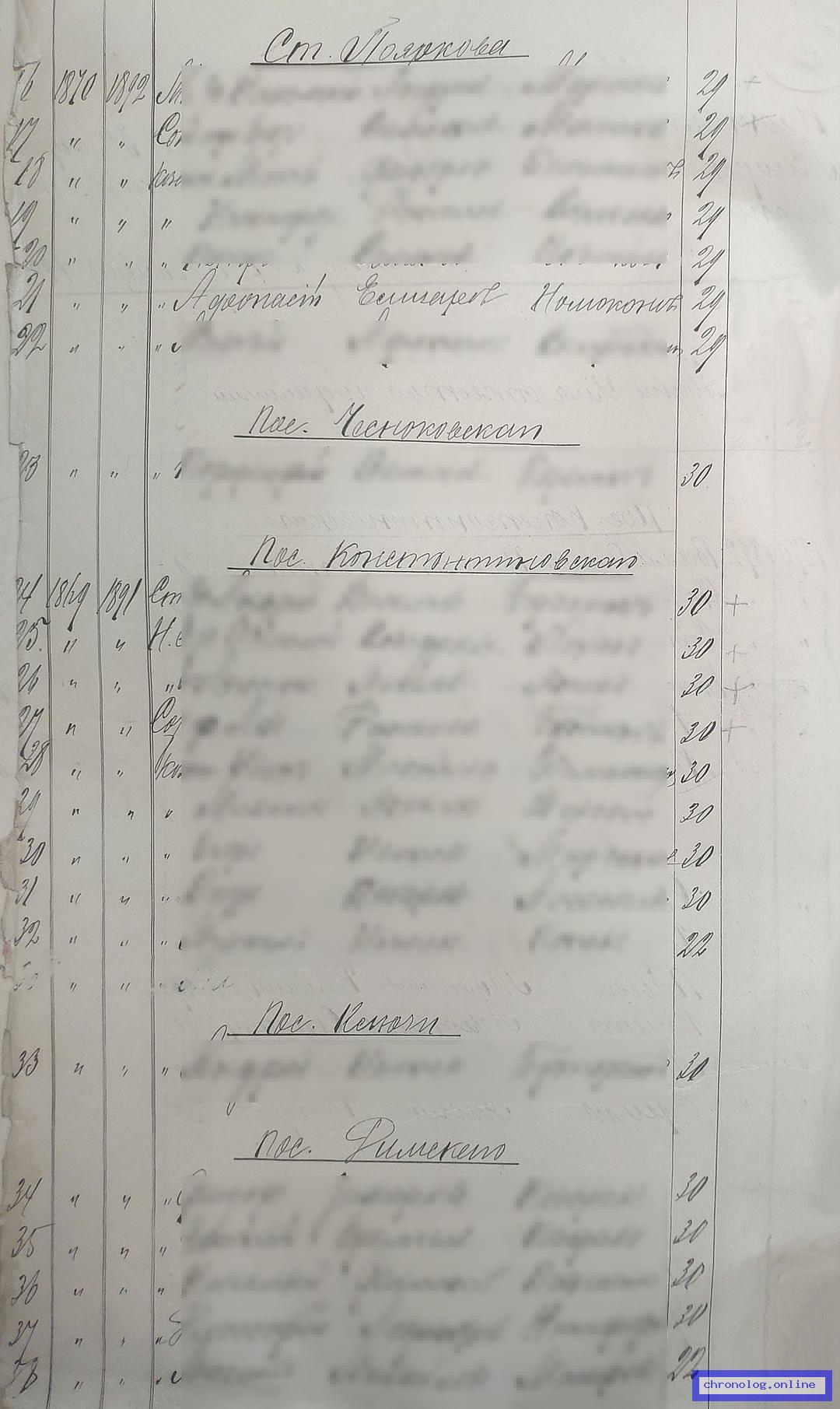 РГИАДВ 793-1-419, Л.157об (Списки казакам, вахмистрам, урядникам Амурского казачьего войска по возрастам, разрядам и округам на 1900 год): Казак Афанасий Елизарович Номоконов 29 лет из станицы Поярково показан в списке третьей очереди по Поярковскому станичному округу. Время и место исхода не показано. Снимки: 157об. | |||