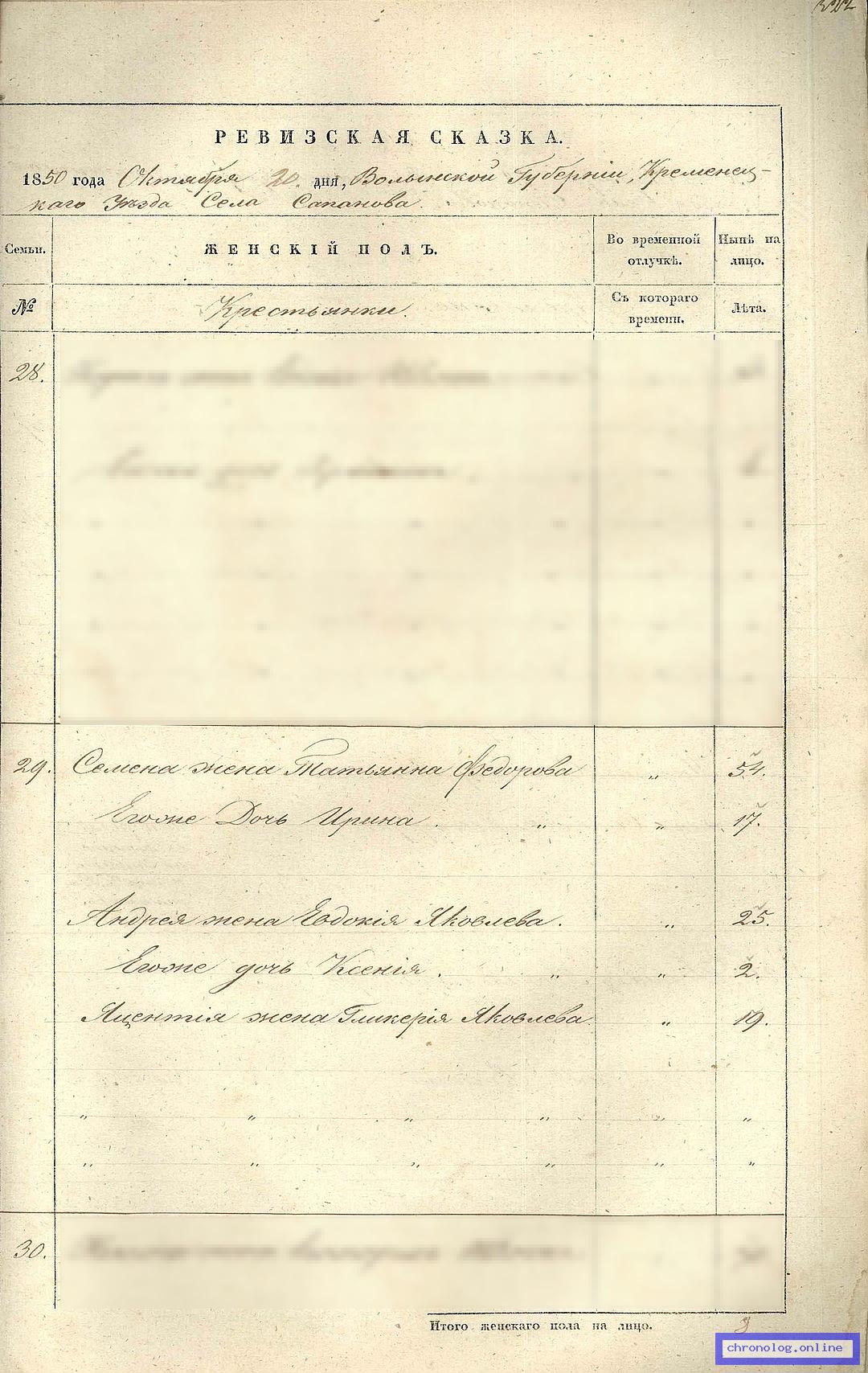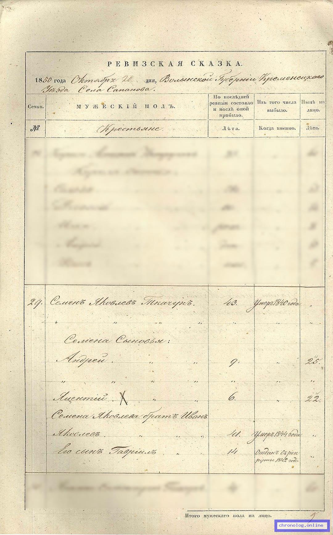 ГАТО 37-2-178, Л.321об, 322 (Ревизская сказка Кременецкого уезда на 1850 год): Семен Яковлев Ткачук 43 лет, умер в 1840 году. Семёна жена Татьяна Федорова 54 лет. Семёна сыновья: Андрей 25 лет, Яцентий 22 лет. Андрея жена Евдокия Яковлева 25 лет. Андрея дочь Ксения 2 года. Яцентия жена Гликерия Яковлева 19 лет. Семёна брат Иван Яковлев 41 лет, умер в 1844 году. Ивана сын Гавриил 14 лет, рекрут с 1842 года. Время и место исхода не показано. Снимки: 321об, 322. | |||