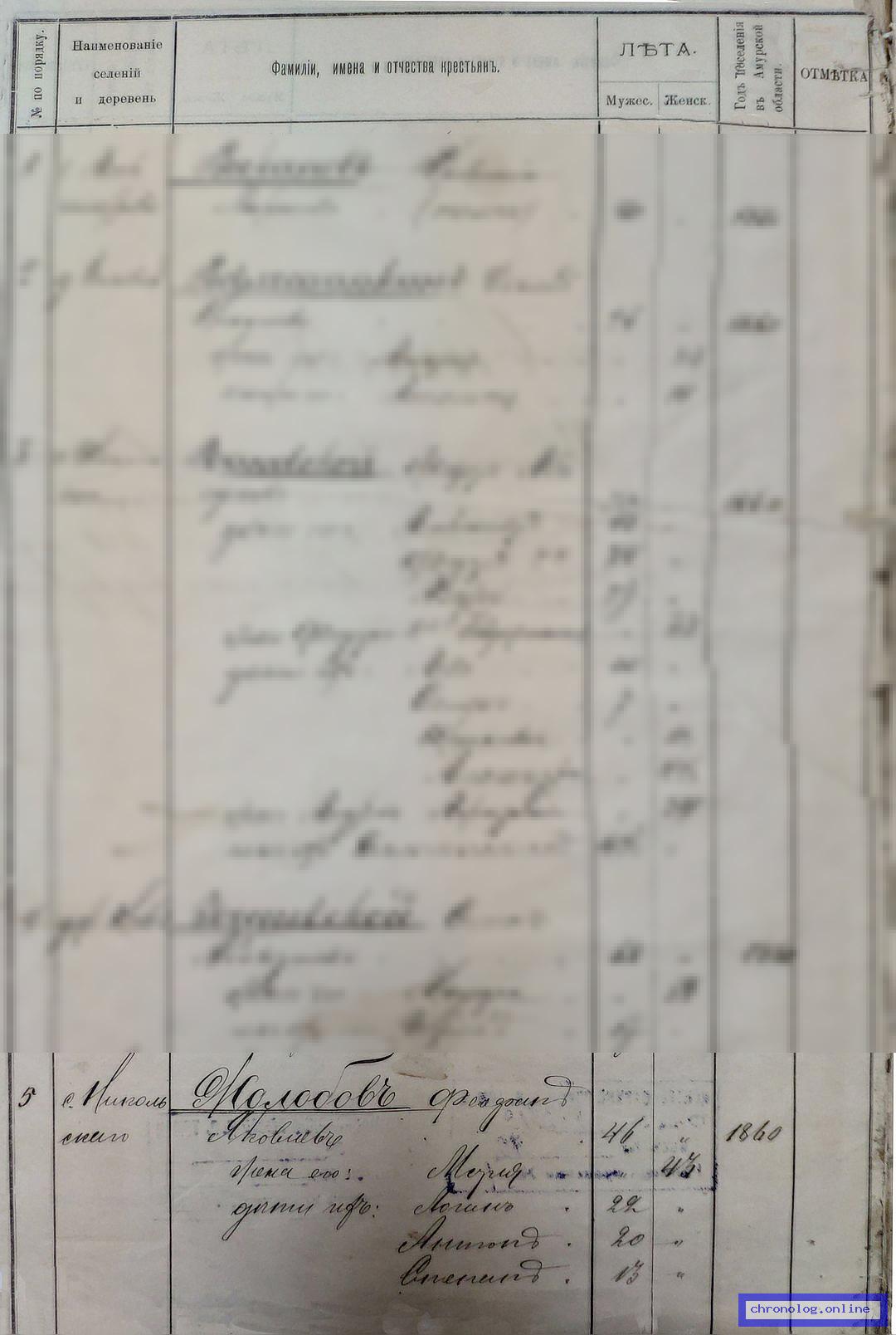 РГИАДВ 704-4-6107, Л.1об., 2 (Список крестьян Томской волости на 1900 год): Жолобов Феофан Яковлевич 46 лет. Жена его Мария 43 лет, дети их: Логин 22 лет, Антон 20 лет, Степан 13 лет, Павел 8 лет, Анисья 17 лет, Ирина 15 лет, Дарья 5 лет 6 месяцев. Жительствуют в селе Никольском с 1860 года. Время и место исхода не показано. Снимки: 1об, 2. | |||