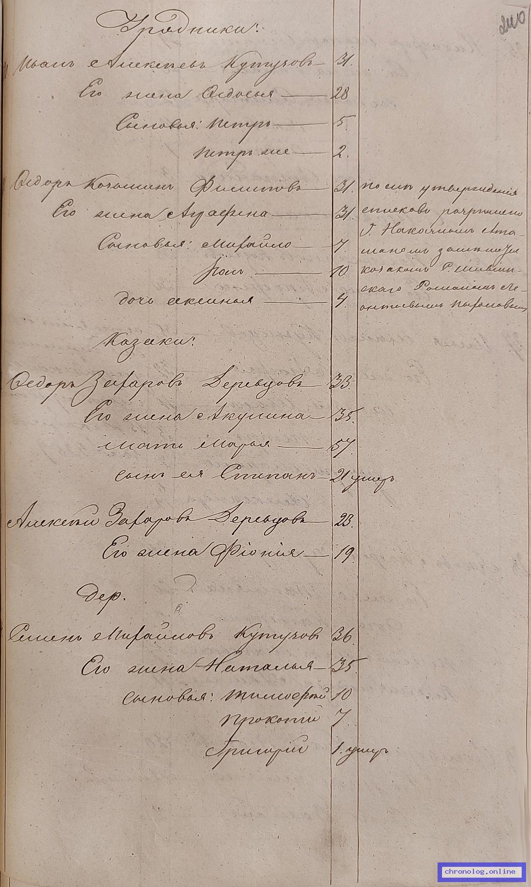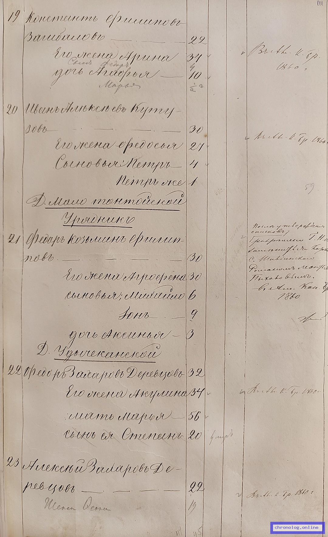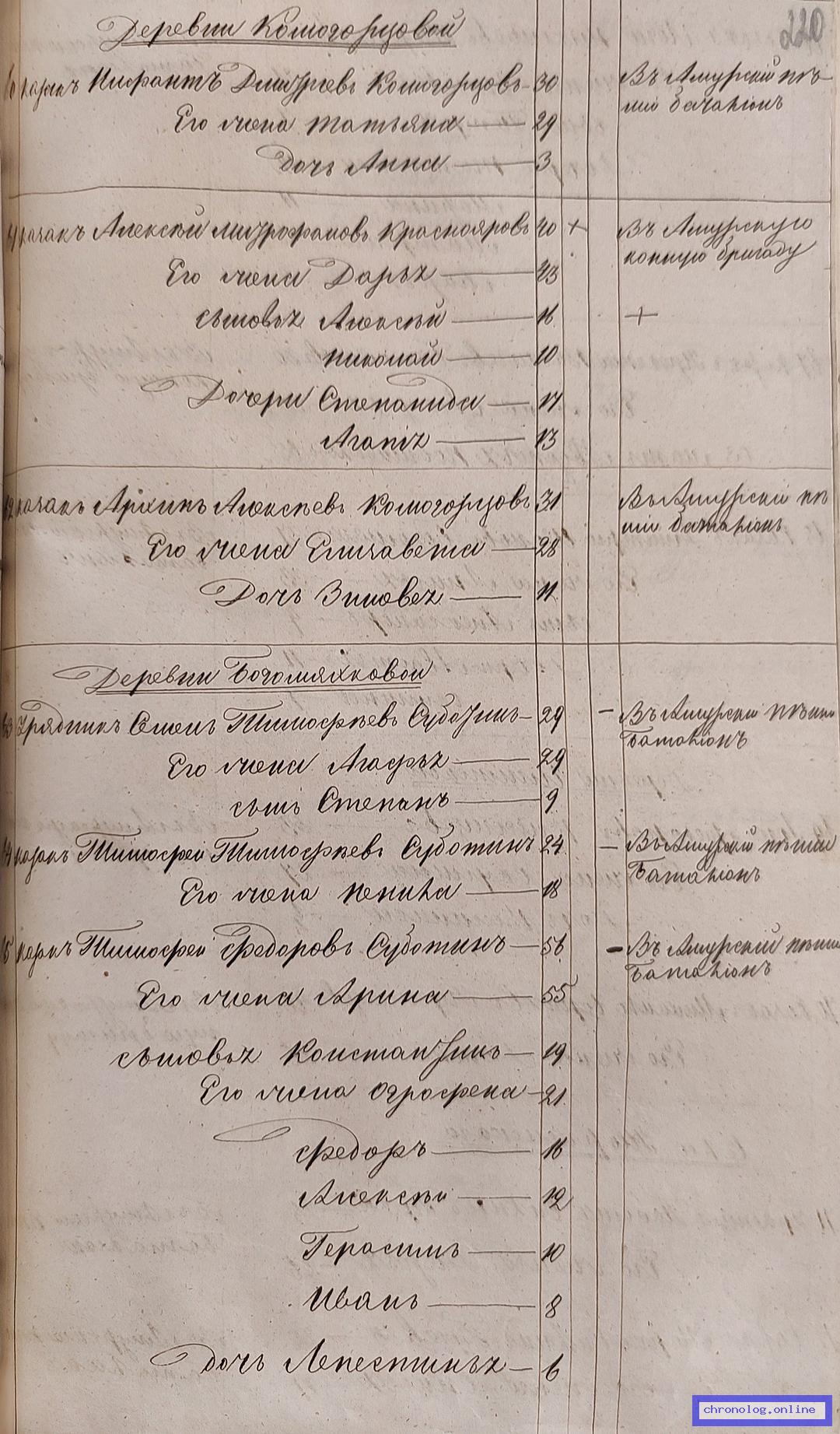 ГАЗК 30-2-270, Л.115об, 116, 244об (Посемейные списки переселенцев на р. Амур): Казак 11-го пешего батальона Егор Григорьевич Чикечев-Чикичев 44 его жена Матрена 40 сыновья Тимофей 13 Василий 10 дочери Парасковья 18 Авдотья 16. Исход: село Шивеинское Нерчинского уезда. Снимки: 115об, 116, 244об. | |||