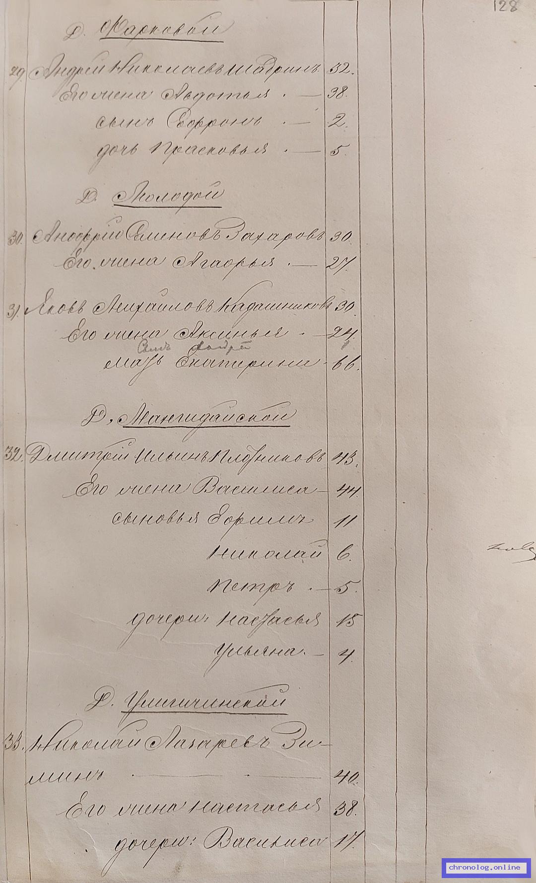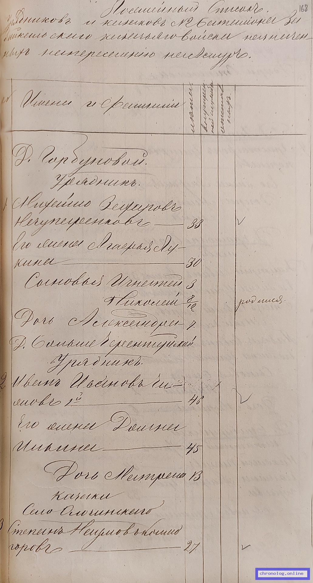 ГАЗК 30-2-270, Л.128, 128об, 255об (Посемейные списки переселенцев на р. Амур): Казак 12-го пешего батальона Николай Лазаревич Зимин 41 его жена Настасья 39 дочери Василиса 18 Катерина 16 Дарья 13 Палагея 7 Укулина 1 месяц. Исход: деревня Улигичинская Нерчинского уезда. Снимки: 128, 128об, 255об. | |||