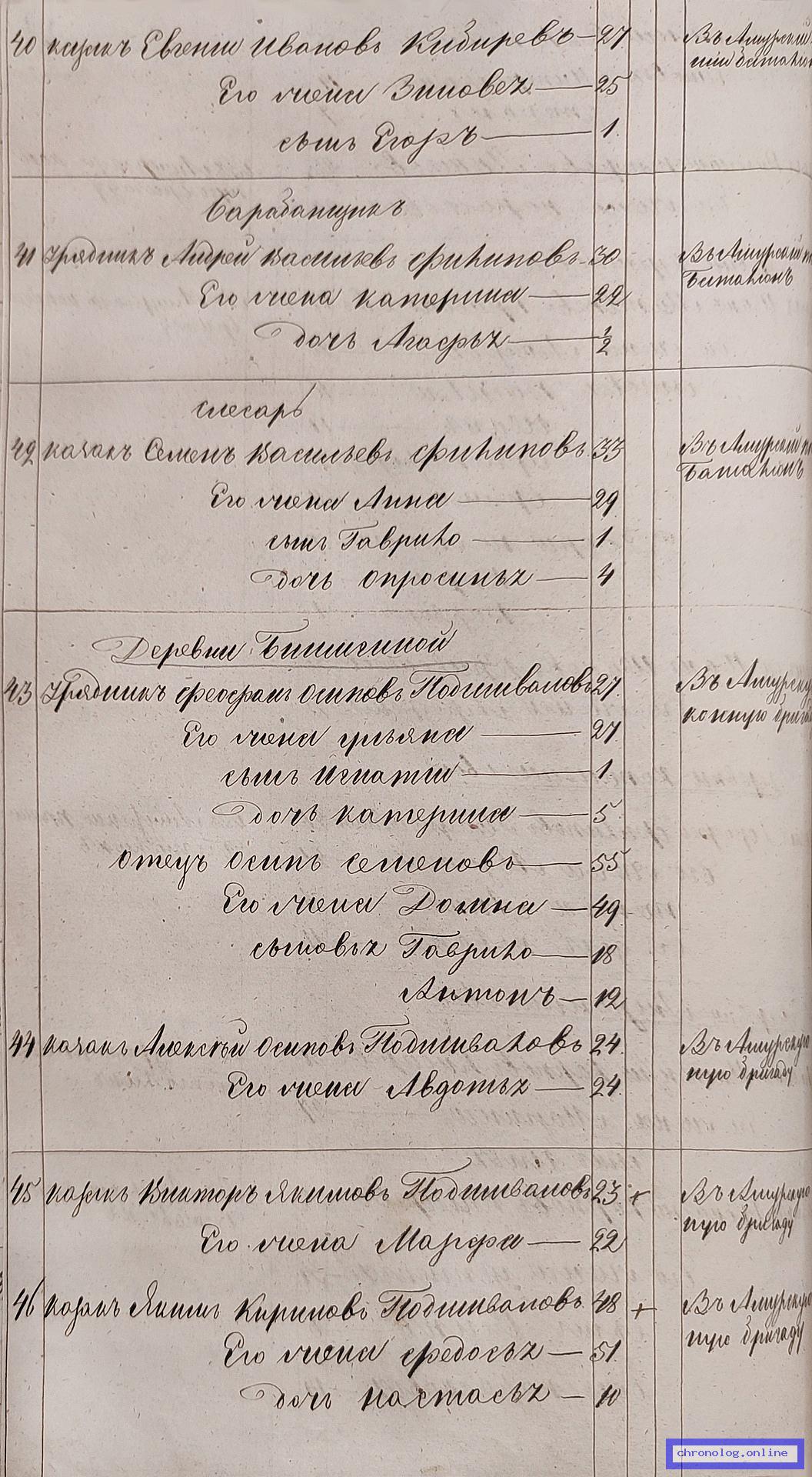 ГАЗК 30-2-270, Л.89, 131, 218об (Посемейные списки переселенцев на р. Амур): Казак 9-го пешего батальона Яким Кириллович Подшивалов 47 его жена Федосья 51 дочь Авдотья 15 Настасья 10. Исход: деревня Бишигина Нерчинского уезда. Снимки: 89, 131, 218об. | |||