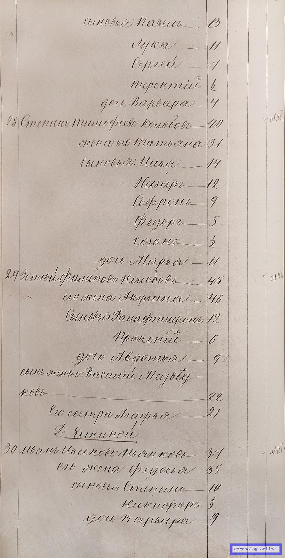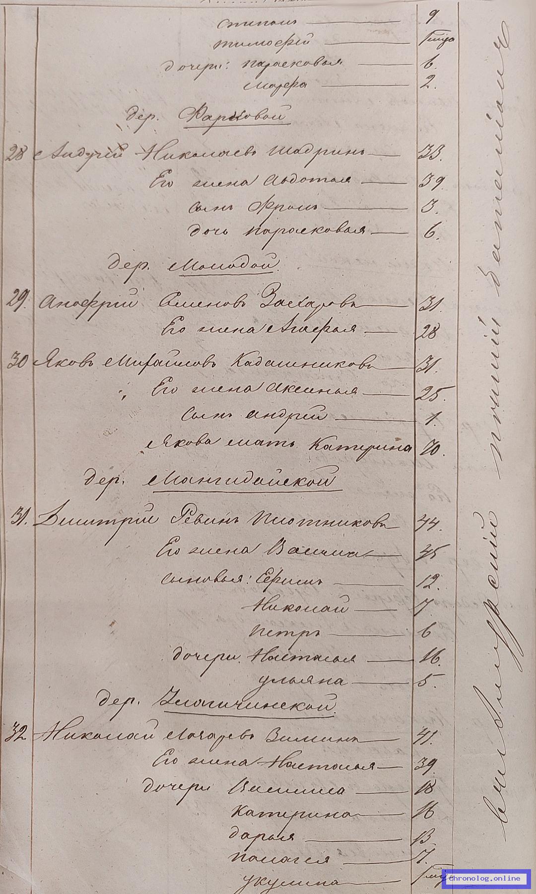 РГИАДВ 704-4-707, Л.43об.,44 (Записи переселенцев, причисленных к сословию мещан и общественных крестьян Амурской области за 1895 год): Отставной солдат Егор Иванович Шульмин 66 лет, вдов. Сын его Кузьма 29 лет, жена его Варвара 28 лет, дети их: Кузьма 9 лет, Екатерина 1 месяц 8 дней. Исход: заимка Шараповская Верхосунской волости Нолинского уезда Вятской губернии. Снимки: 43об, 44. | |||