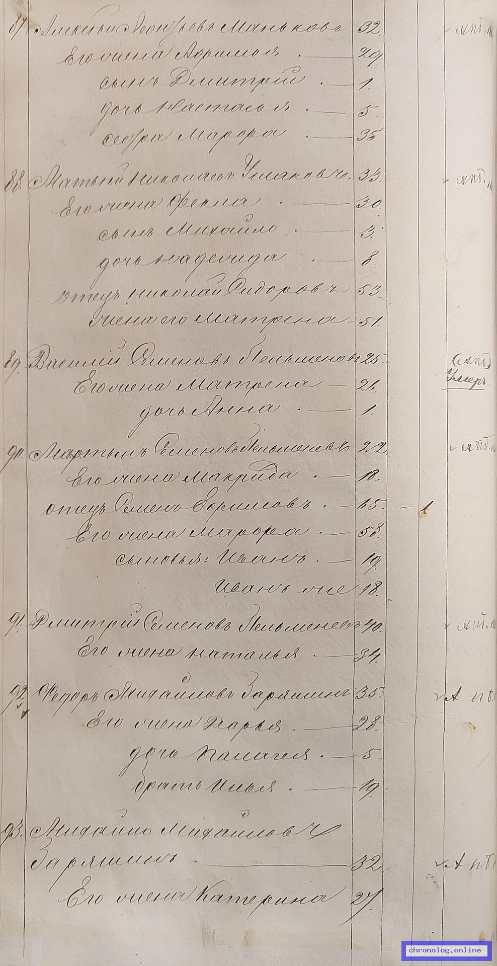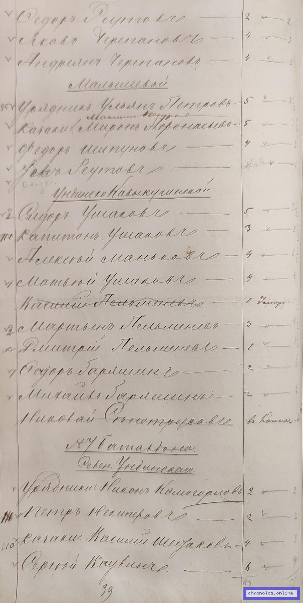 ГАЗК 30-2-270, Л.71об, 72, 138об (Посемейные списки переселенцев на р. Амур): Казак 7-го пешего батальона Василис Иванович Ушаков 41 его жена Наталья 38 сын Максим 4 дочь Авдотья 12 Харитинья 6. Исход: деревня Онохова Нерчинского уезда. Снимки: 71об, 72, 138об. | |||