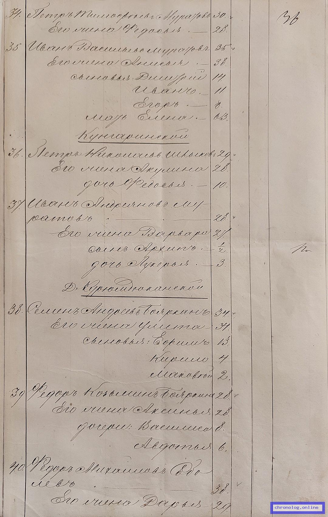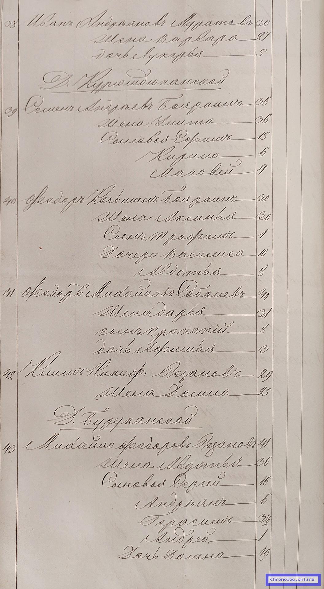 ГАЗК 30-2-270, Л.52об, 53, 130об (Посемейные списки переселенцев на р. Амур): Казак 6-го пешего батальона Андрей Егорович Кочев 34 его жена Прасковья 33 сын Яков 13 дочери Акулина 12 Агафья полгода. Исход: деревня Тергенская Нерчинского уезда. Снимки: 52об, 53, 130об. | |||