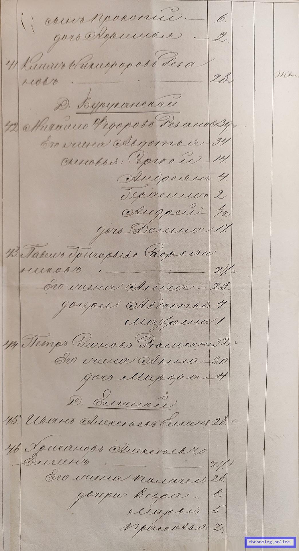 ГАЗК 30-2-270, Л.30, 129, 174 (Посемейные списки переселенцев на р. Амур): Казак 3-го пешего батальона Леонтий Петрович Башуров 48 жена Анна 48 сыновья Ефим 21 Селиверст 19 Гаврило 17 Иннокентий 6 дочери Лукерья 13 Матрена 10. Исход: деревня Марьина Нерчинского уезда. Снимки: 30, 129, 174. | |||