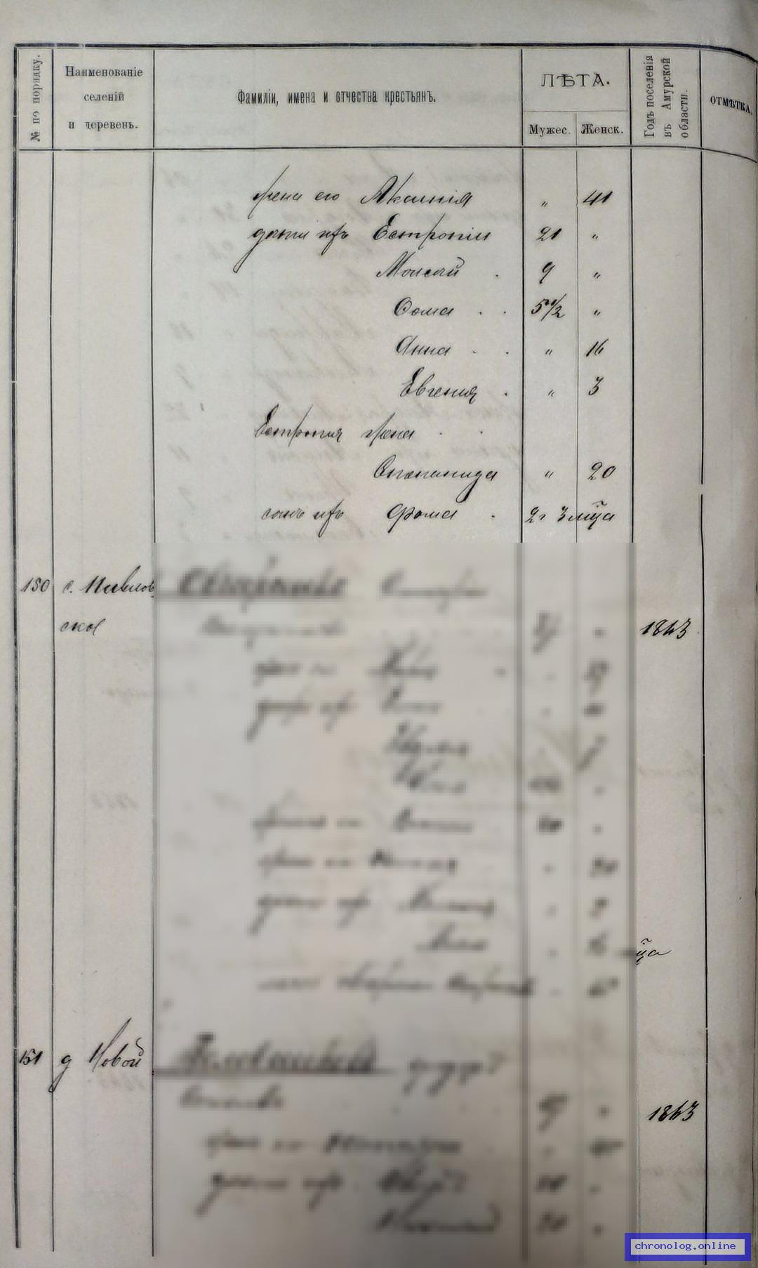 РГИАДВ 704-4-6107, Л.25, 25об (Список крестьян Томской волости на 1900 год): Никифоров Анисифор Ефимович 41 лет. Жена его Аксиния 41 лет, дети их: Естропий 21 лет, Моисей 9 лет, Фома 5½ лет, Анна 16 лет, Евгения 3 года. Жена Естропия Степанида 20 лет, сын их Фома 2 года 3 месяца. Жительствуют в деревне Листвянке с 1863 года. Время и место исхода не показано. Снимки: 25, 25об. | |||