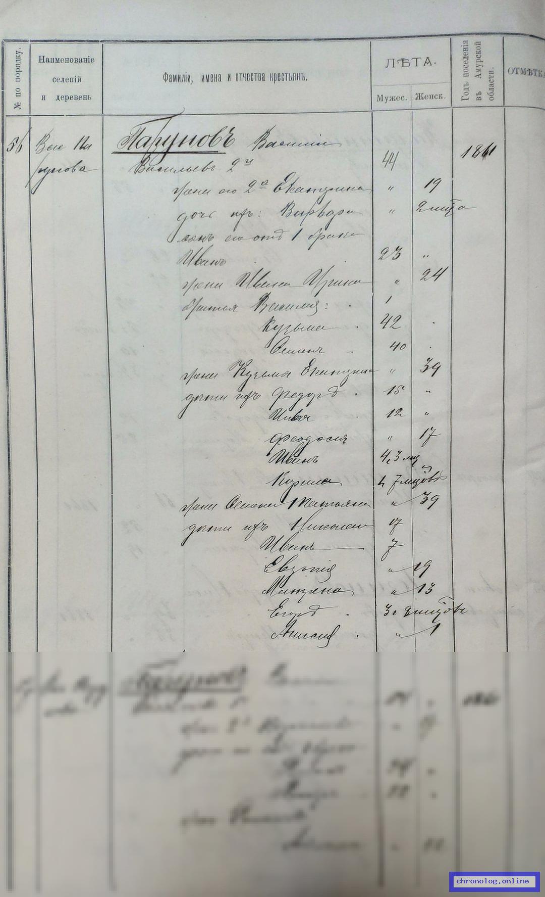 РГИАДВ 704-4-6107, Л.9об (Список крестьян Томской волости на 1900 год): Парунов Василий-Второй Васильевич 44 лет, у него жена (вторая) Екатерина 19 лет, у них дочь Варвара 2 месяца. Сын от первого брака Иван 23 лет, у него жена Ирина 24 лет. Брат Кузьма Васильевич 42 лет, у него жена Екатерина 39 лет, у них дети: Фёдор 15 лет, Илья 12 лет, Феодосия 17 лет, Иван 4 года и 3 месяца, Кирилл 1 год и 7 месяцев. Брат Семён Васильевич 40 лет, у него жена Татьяна 39 лет, у них дети: Николай 17 лет, Иван 7 лет, Евдокия 19 лет, Матрона 13 лет, Егор 3 года и 8 месяцев, Анисия 1 год. Жительствуют на выселке Паруновском с 1861 года. Время и место исхода не показано. Снимки: 9об. | |||