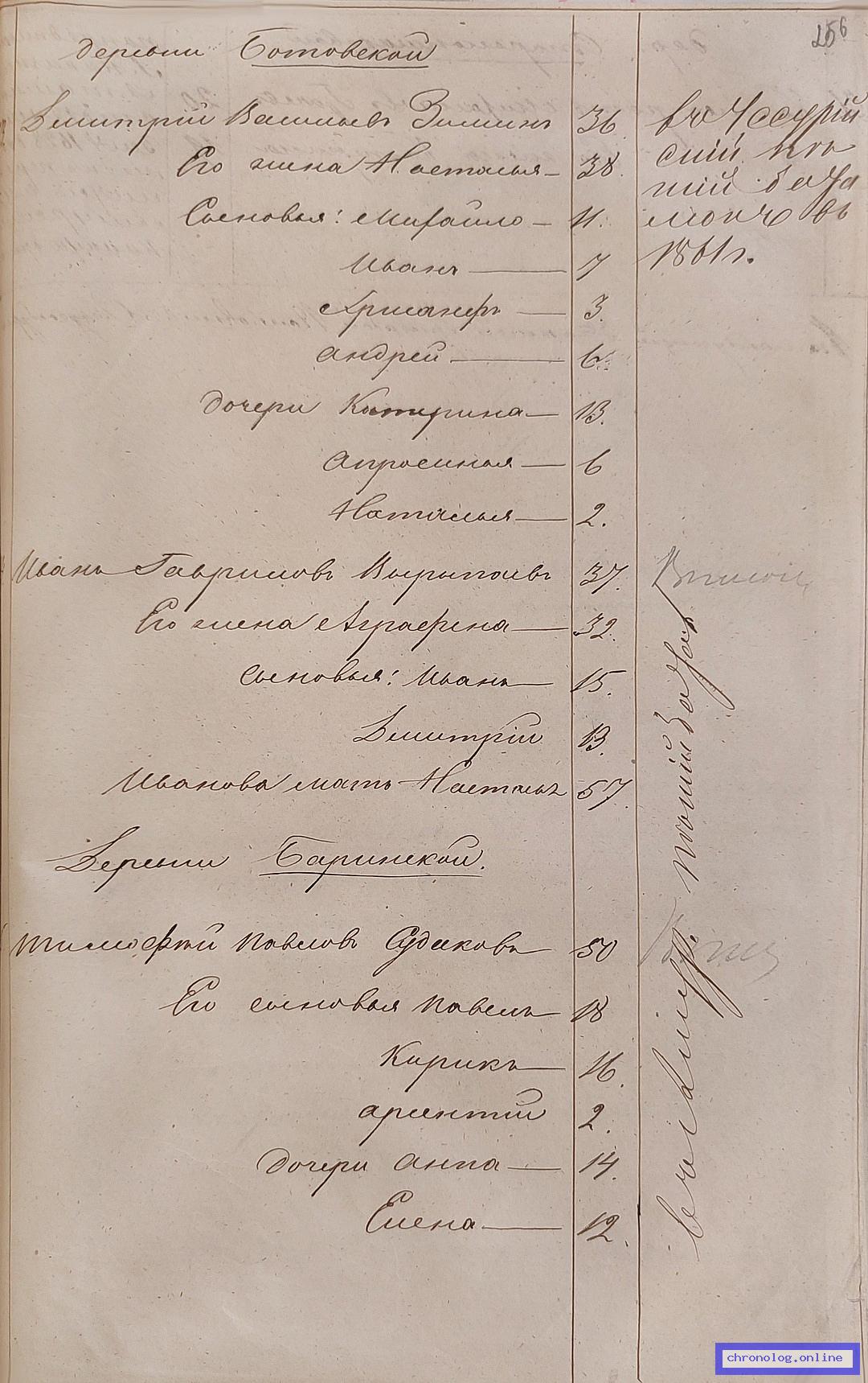 ГАЗК 30-2-270, Л.119об, 142, 256 (Посемейные списки переселенцев на р. Амур): Казак 12-го пешего батальона Иван Гаврилович Вырыпаев 37 его жена Аграфина 32 сыновья Иван 15 Дмитрий 13 Ивана мать Настасья 57. Исход: деревня Ботовская Нерчинского уезда. Снимки: 119об, 142, 256. | |||