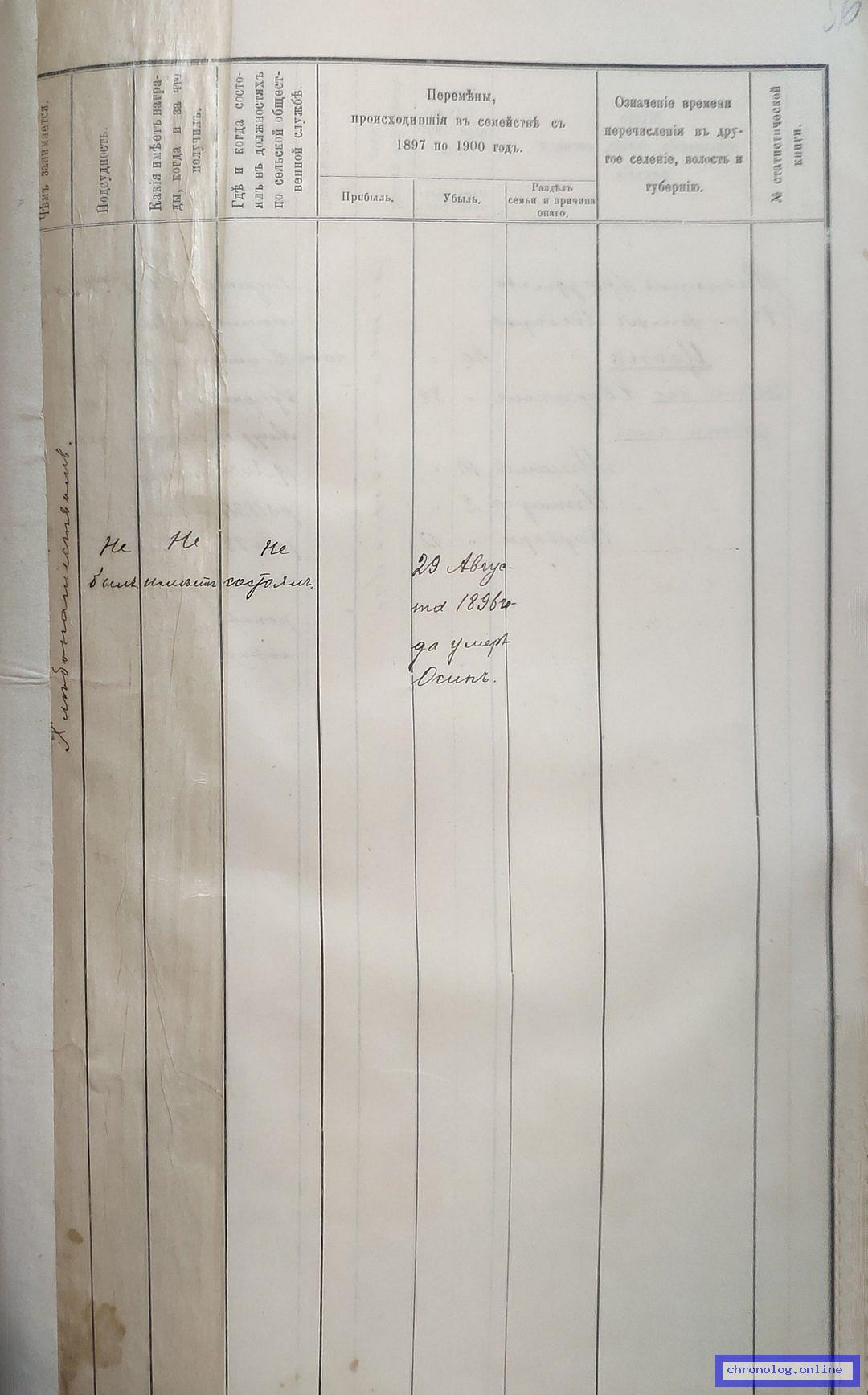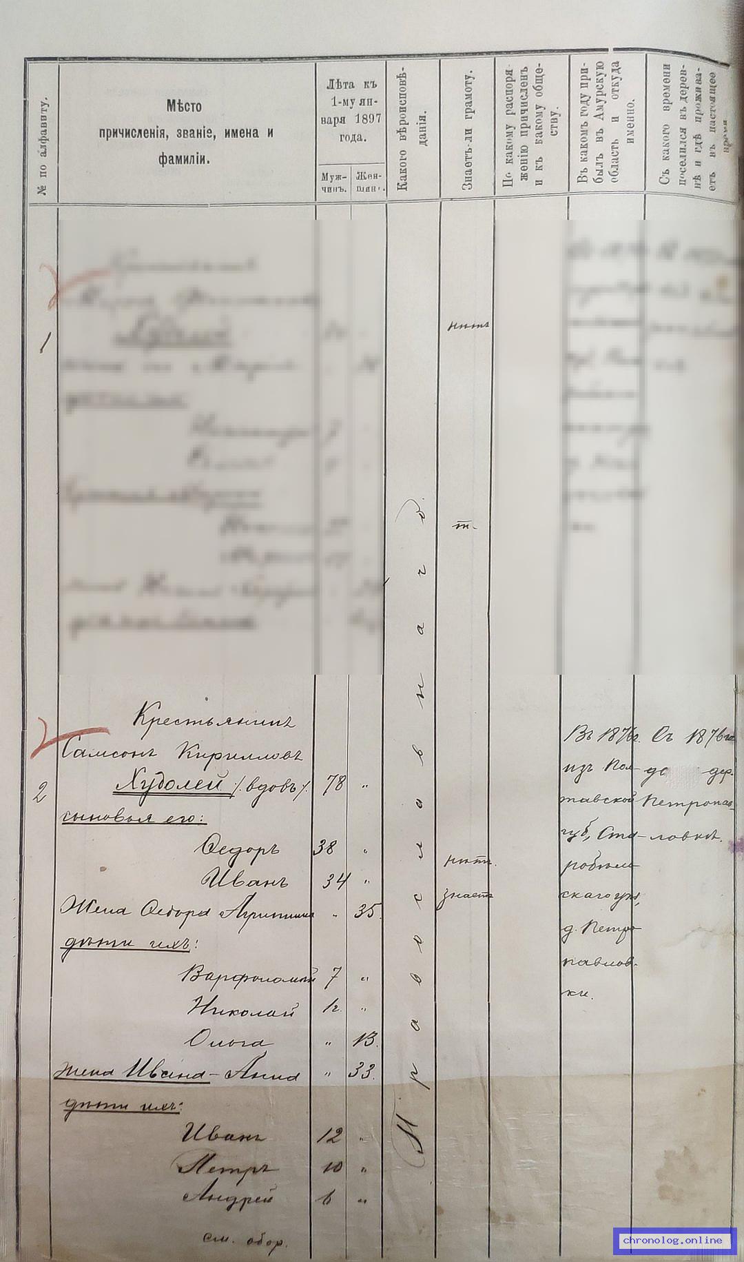 РГИАДВ 704-4-704, Л.54об., 55, 55об., 56 (Списки крестьян деревни Петропавловки на 1897 год): Самсон Кириллович Худолей 78 лет. Дети: Фёдор 38 лет, Иван 34 лет. Жена Фёдора Агрипина 35 лет, дети: Варфоломей 7 лет, Николай 1 год, Ольга 13 лет. Жена Ивана Анна 33 лет, дети: Иван 12 лет, Пётр 10 лет, Андрей 6 лет, Степан 5 лет, Татьяна 8 лет, Егор 1 год 8 месяцев. Исход: деревня Петропавловка Старобельского уезда Харьковской губернии. Снимки: 54об, 55, 55об, 56. | |||