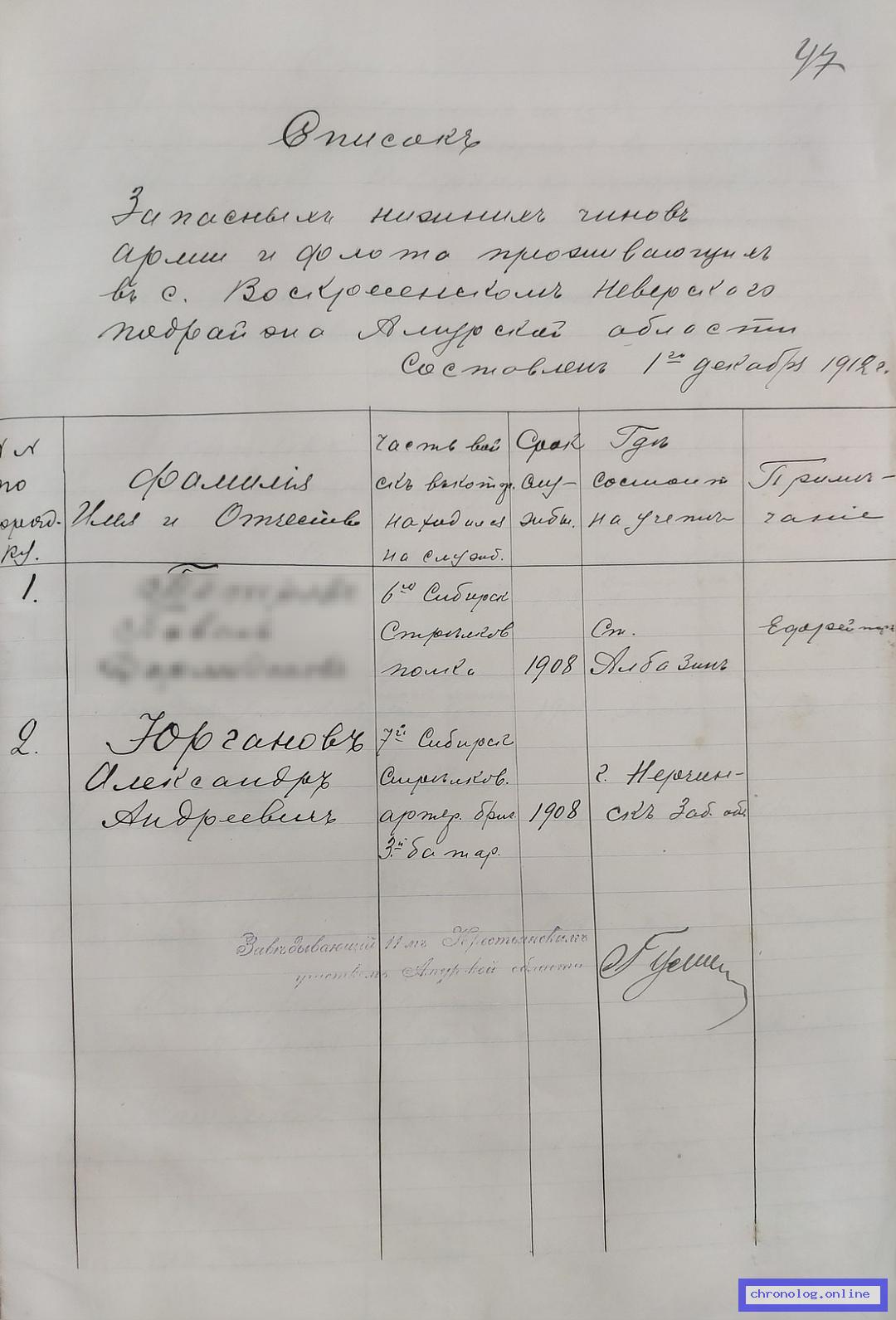 РГИАДВ 704-4-3228, Л.47 (Списки запасных солдат армии и флота, переселившихся в Амурскую область за 1912 год): Запасной нижний чин 7-го Сибирского стрелковой артиллерийской бригады Александр Андреевич Юрганов. Исход: город Нерчинск Забайкальской области. Снимки: 47. | |||