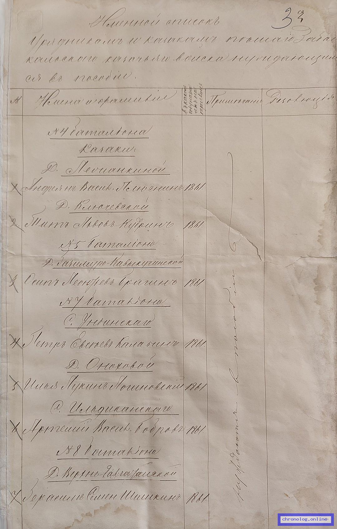 ГАЗК 30-2-297, Л.3 (О выдаче беднейшим казакам дополнительного пособия): Казак 8-го батальона Герасим Семёнович Шишкин показан в списке урядникам и казакам, нуждающимся в пособии. Исход: Деревня Верхнегалгатайская Нерчинского уезда. Снимки: 3. | |||