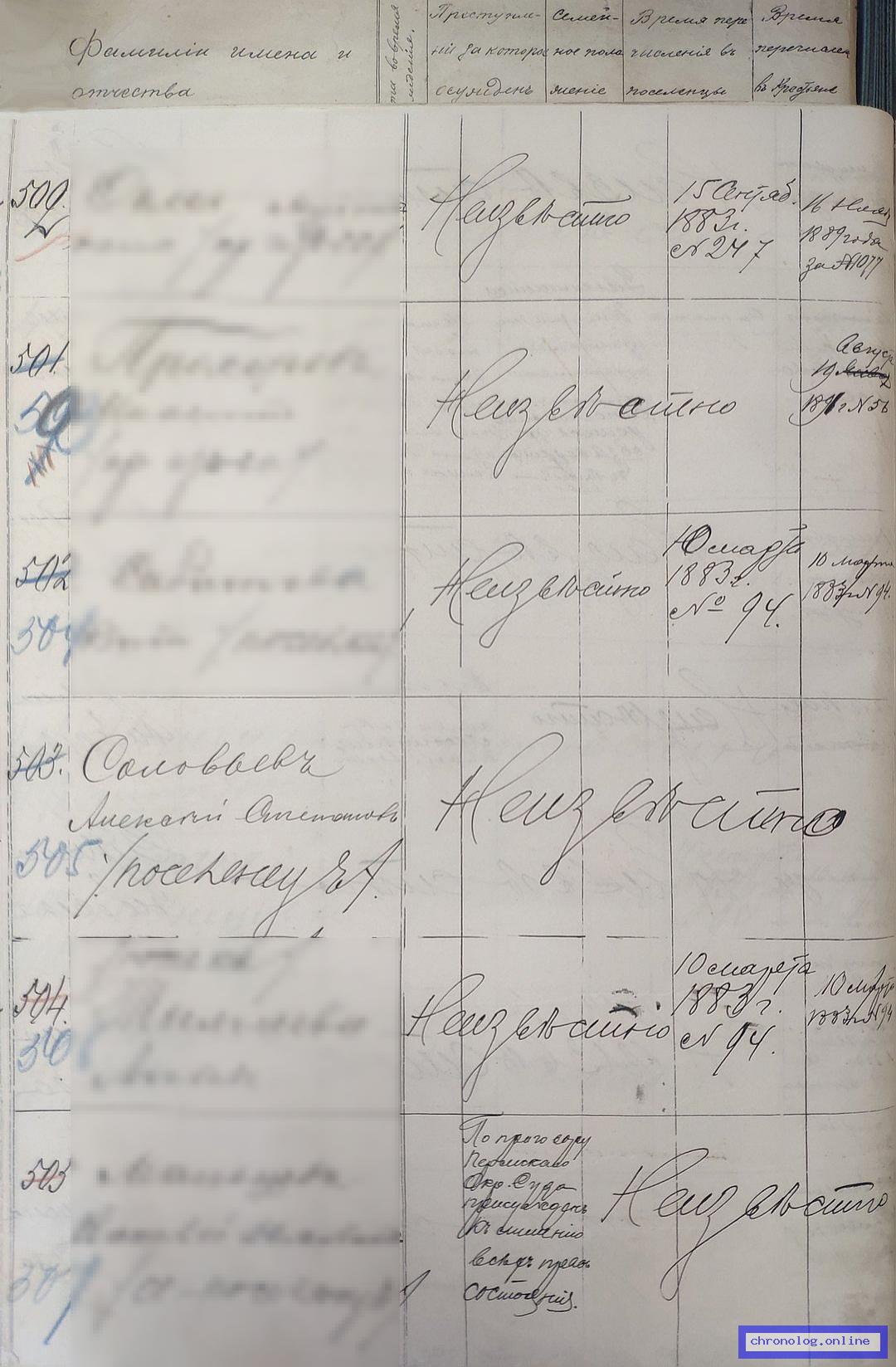 РГИАДВ 704-4-688, Л.70об., 71 (Список ссыльно-поселенцев, причисленных в Амурскую область в 1896 году): В сводной таблице показан поселенец Алексей Степанович Соловьёв. Время и место исхода не показано. Снимки: 70об, 71. | |||
