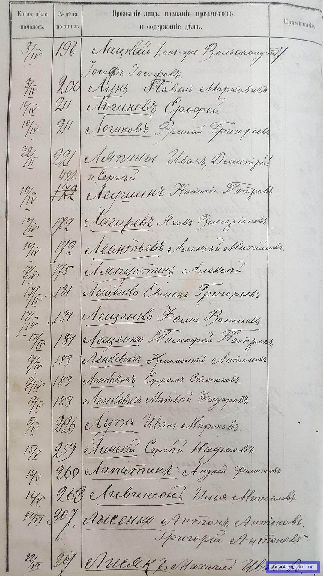 РГИАДВ 704-4-3230, Л.68об (Указатель дел переселенческой части за 1912 год): Лещенко Тимофей Петрович показан со ссылкой на дело (старая опись, нумерация не действительная) №181 от 17.4.1912. Время и место исхода не показано. Снимки: 68об. | |||