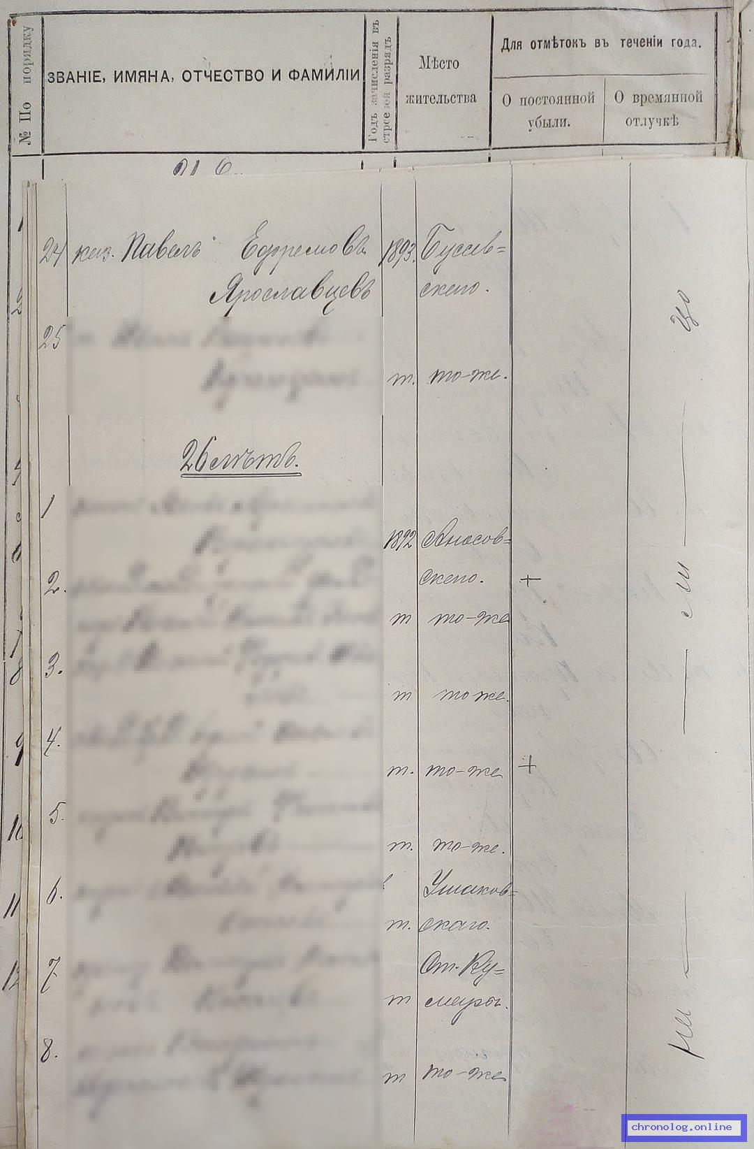 РГИАДВ 793-1-419, Л.80об (Списки казакам, вахмистрам, урядникам Амурского казачьего войска по возрастам, разрядам и округам на 1900 год): Казак Кумарского станичного округа посёлка Буссевского Павел Ефремович Ярославцев 25 лет. Время и место исхода не показано. Снимки: 80об. | |||