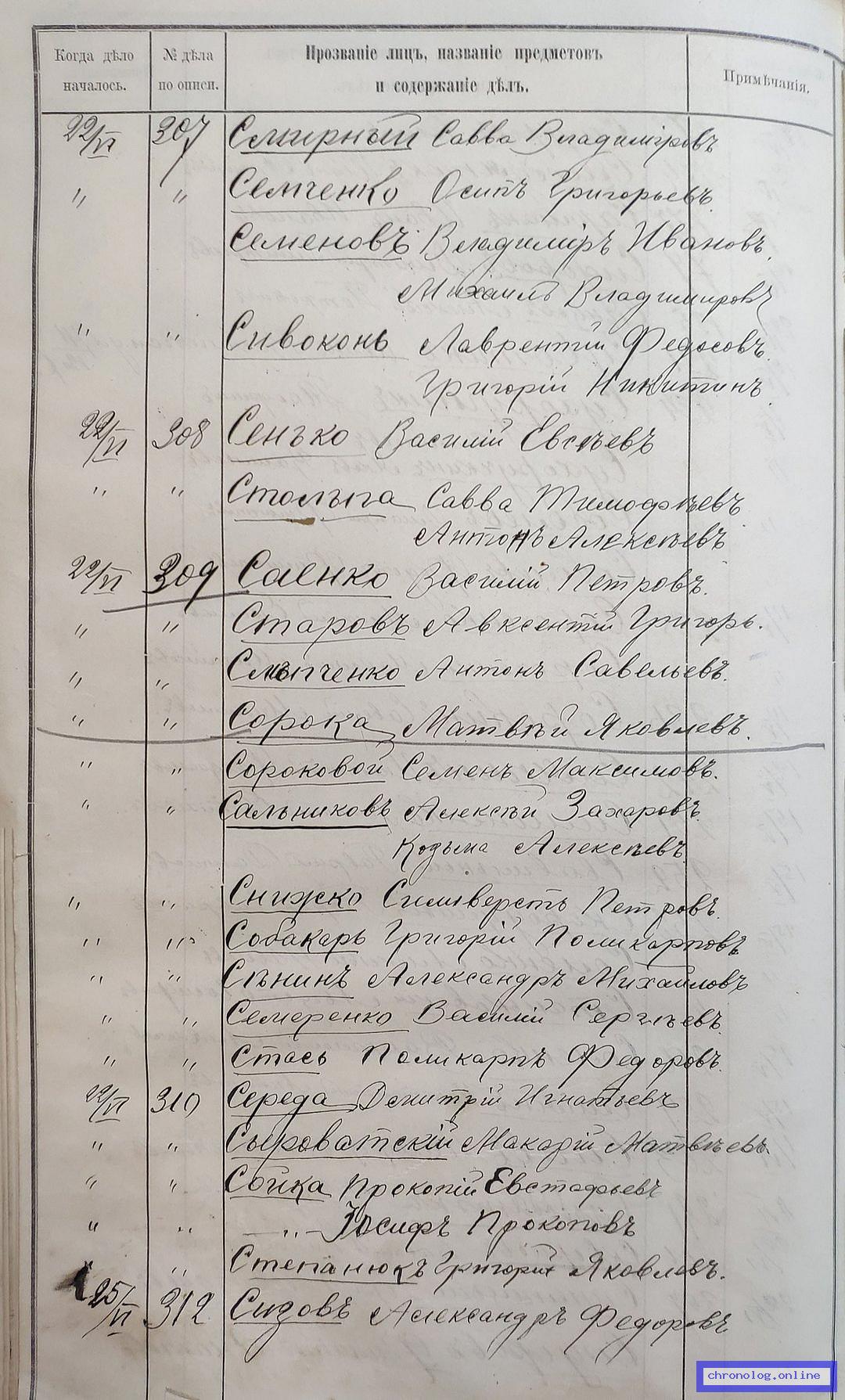 РГИАДВ 704-4-3230, Л.102 (Указатель дел переселенческой части за 1912 год): Питерский Сергий показан со ссылкой на дело (старая опись, нумерация не действительная) №498 от 29.10.1912. Время и место исхода не показано. Снимки: 102. | |||